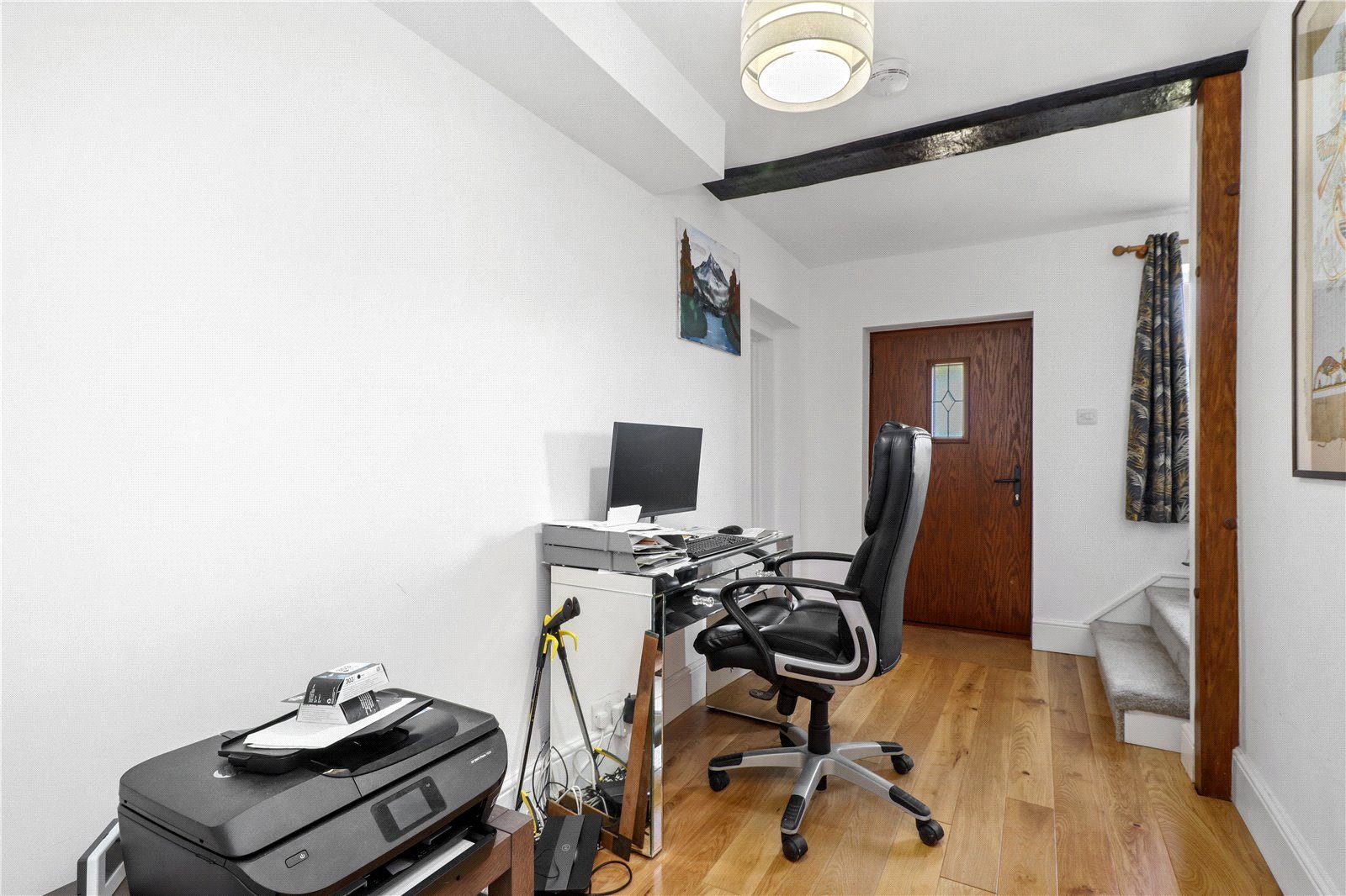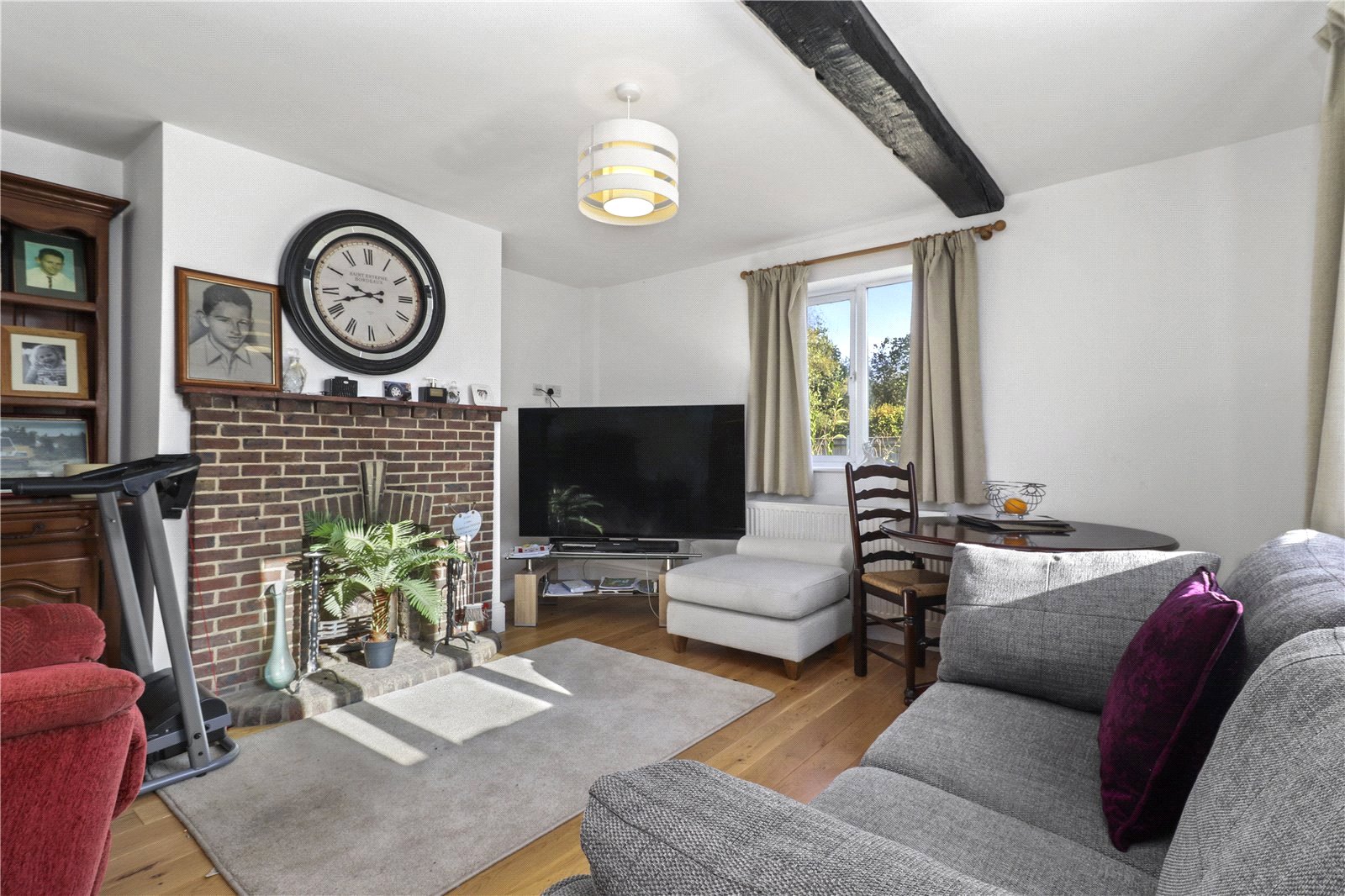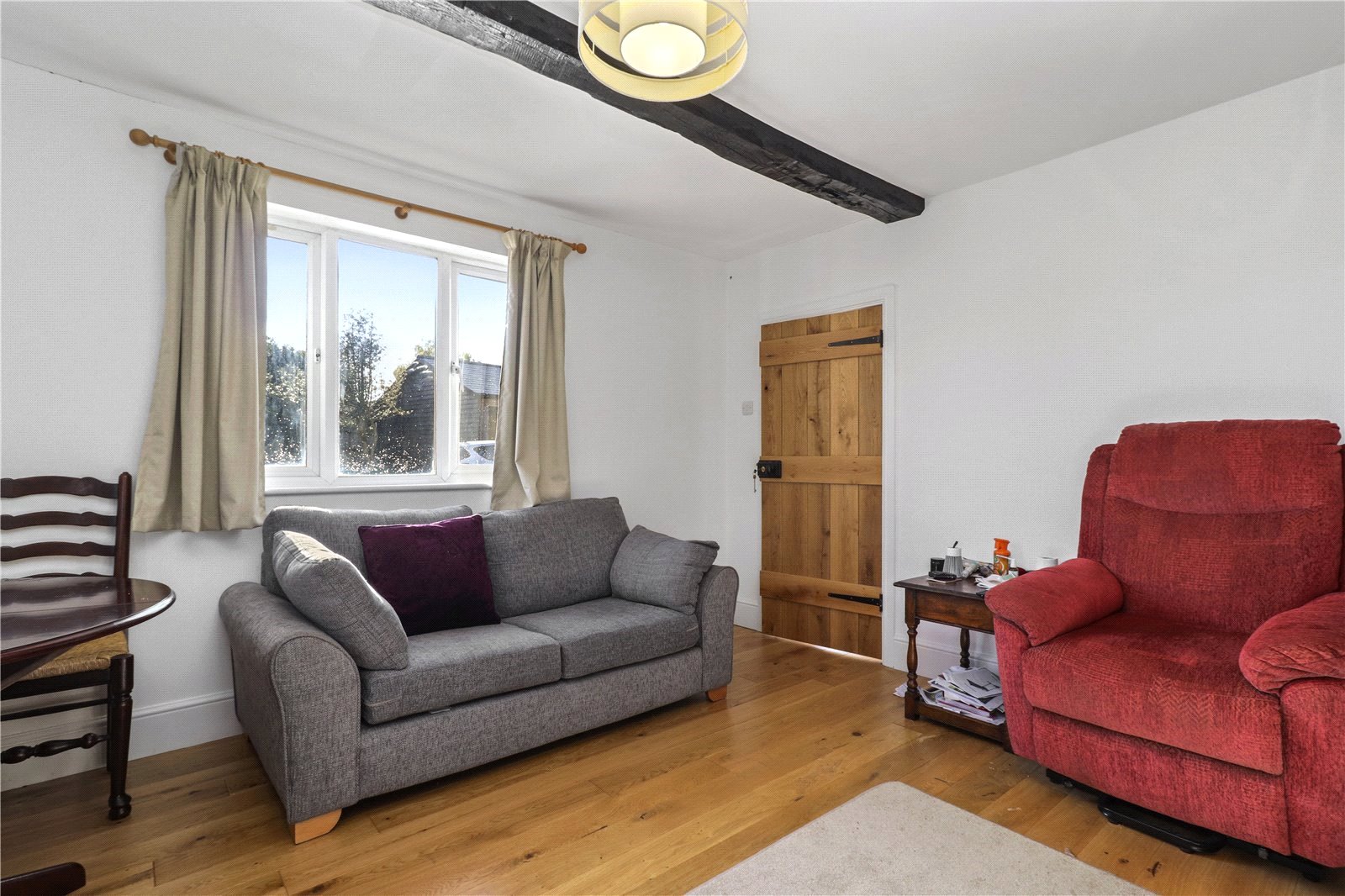 SITTING ROOM: A double aspect room approached from the kitchen via a bespoke character oak door with oak floors, brick fireplace, feature beam to ceiling, radiator, double glazed window with aspect to the front and further double-glazed window with aspect to side.