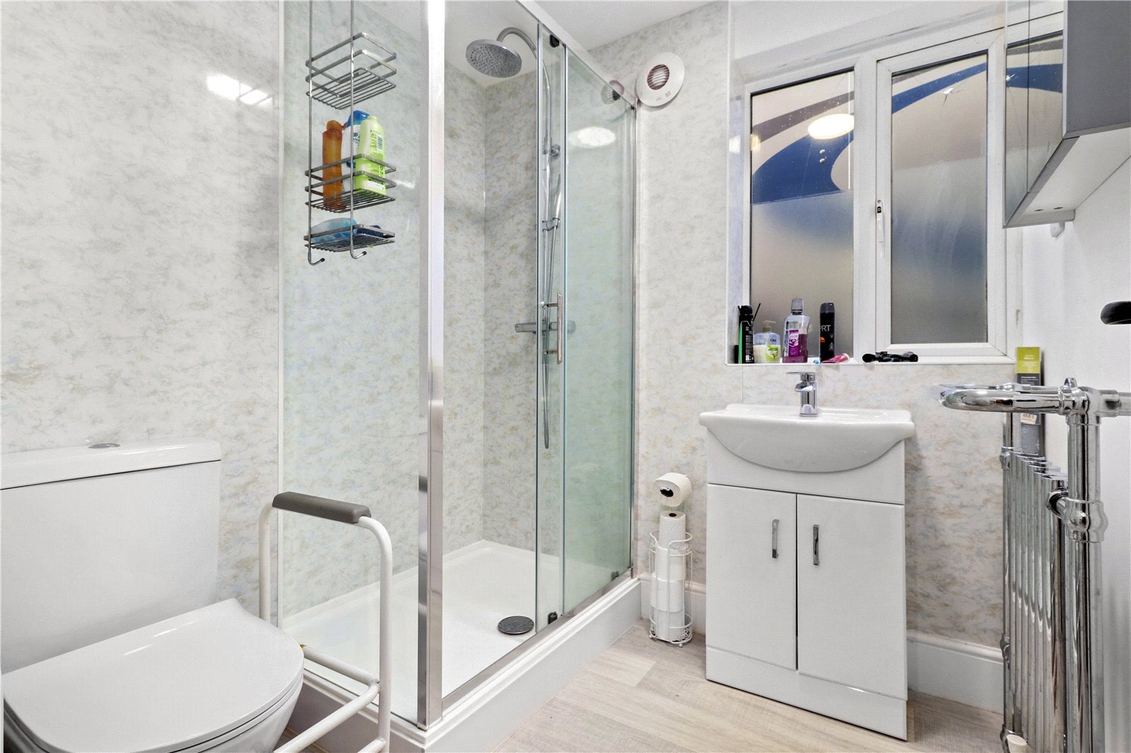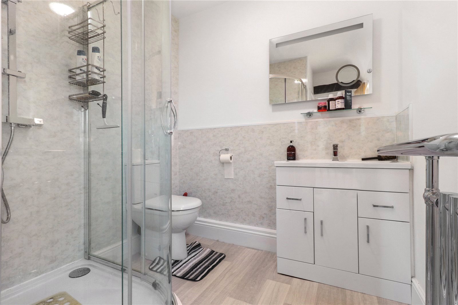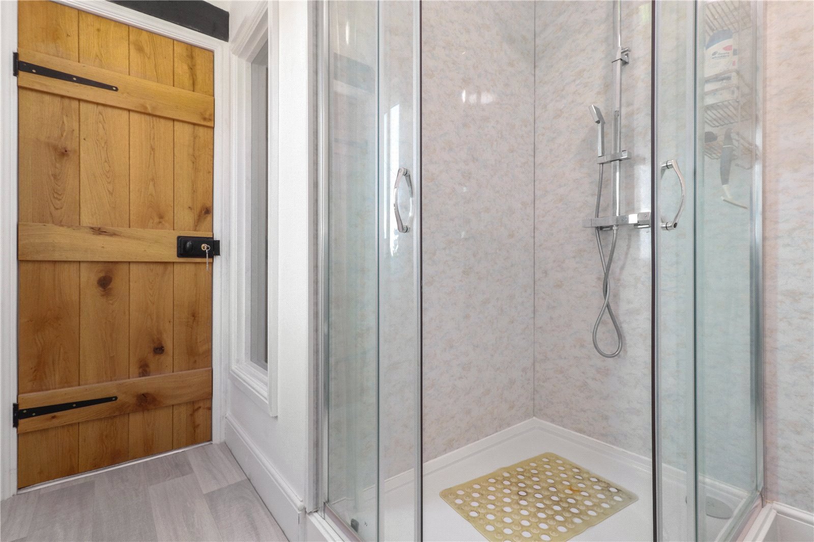 DOWNSTAIRS SHOWER ROOM AND CLOAKROOM: Comprising of a W.C., wash basin with chrome mixer tap and cupboard under, heated chrome towel rail, double sized shower with glazed front, double glazed window, extractor fan.