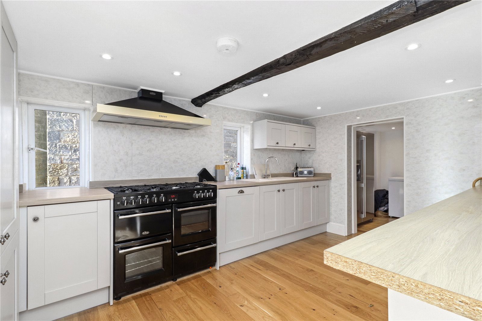 KITCHEN: With a recently fitted range of modern shaker style cupboard and base units with work surfaces over, fitted 1 ½ sink unit with mixer tap, gas cooker range, integrated dishwasher, air purifier hood, double glazed window with aspect to rear, feature beam to ceiling, down lights, hatch to storage area, doors leading off to conservatory / potential breakfast room and sitting room.