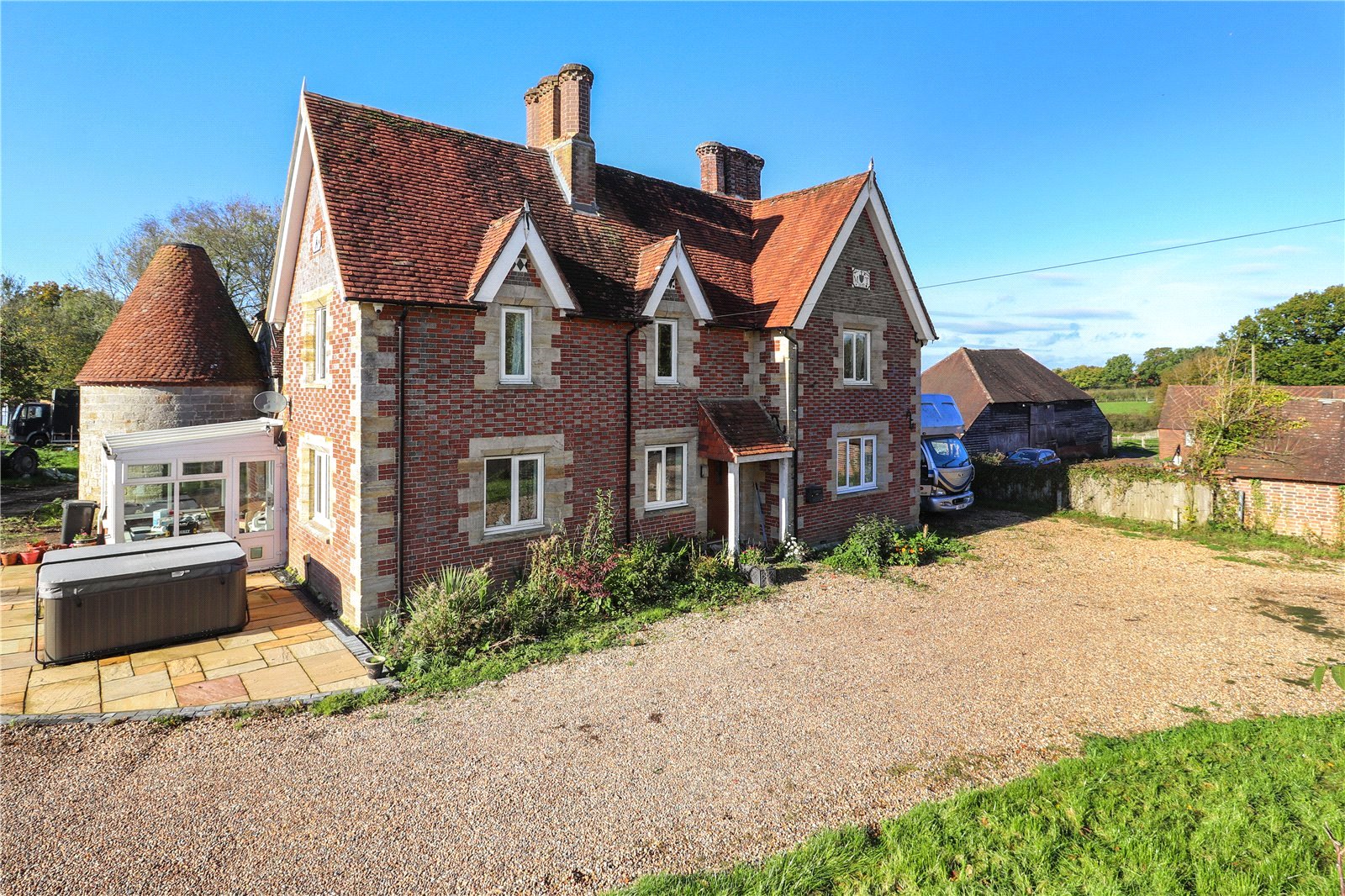 This attractive late 19th century gothic influenced farmhouse, which is set within approximately 1.5 acres (to be verified), also has a separate detached Oast barn / building located behind the main farmhouse. In our opinion this could possibly be converted into a residential annex, or even into a separate dwelling. Furthermore, this building and the main house could also be replaced with perhaps planning to build two bespoke luxury homes, as they are not grade listed and the site has ample area to accommodate this type of redevelopment in our opinion.