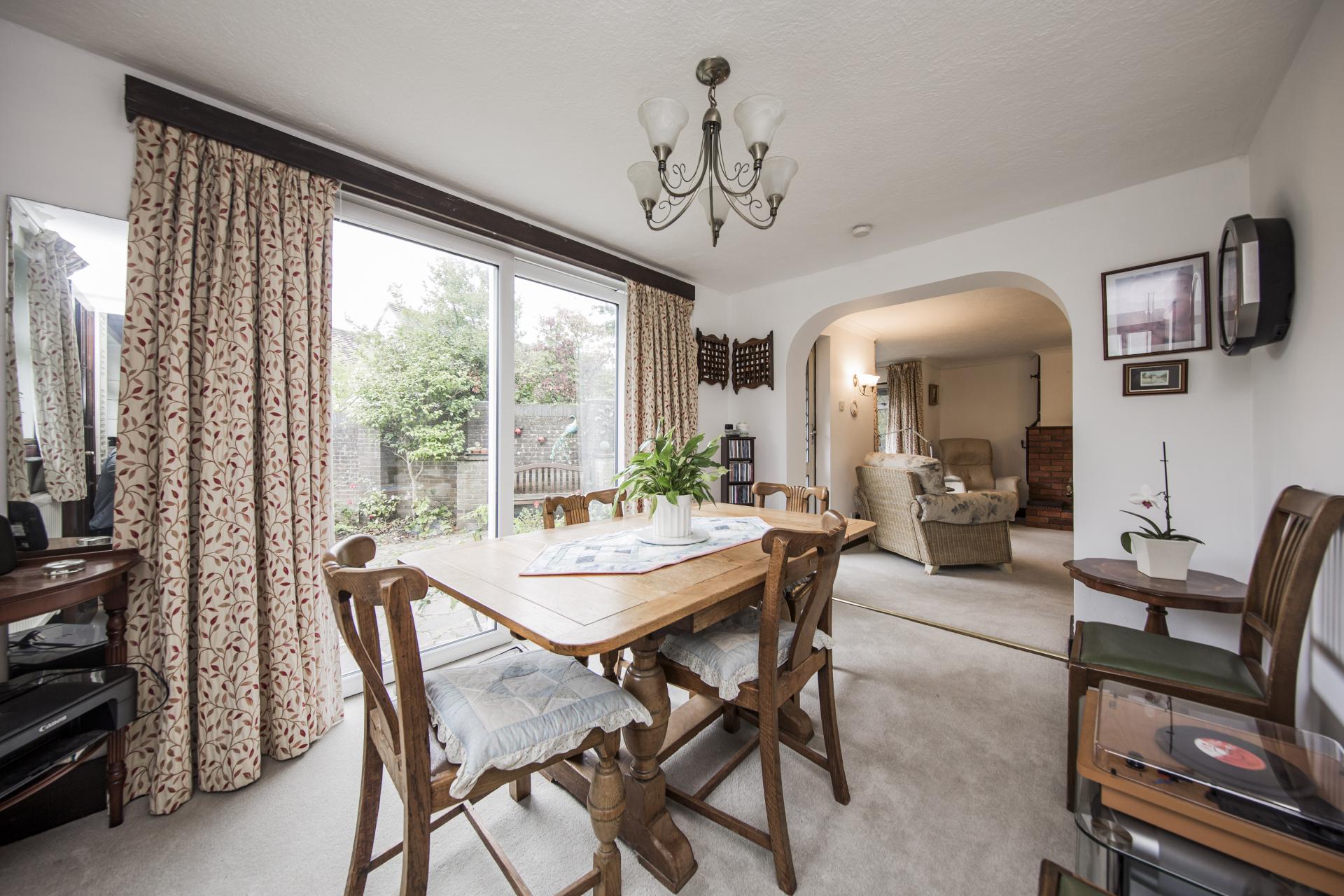 DINING ROOM: Double glazed sliding patio doors leading to the patio area. Further leaded light double glazed window to the side. Radiator. Archway into: