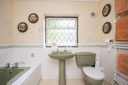 FAMILY BATHROOM: Leaded light double glazed window. Tile enclosed bath. WC. Pedestal wash basin. Part tiled walls. Heated towel rail. Coved ceiling. Inset spotlights.