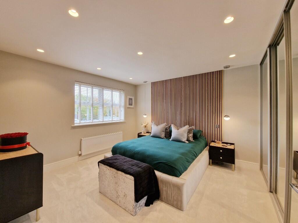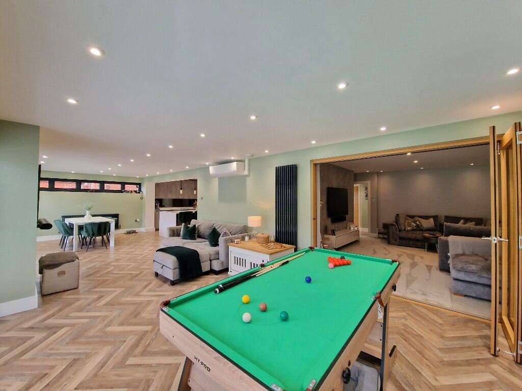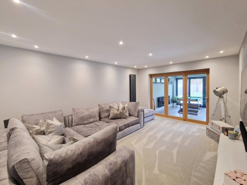 Family Room:- - 10.06m x 4.83m (33' x 15'10) - Smooth ceiling with inset downlighters. Roofline window to side. Two sets of 5 glazed panel folding doors, with integral shutter blinds, opening to landscaped south west facing garden. Media wall. Air conditioning system. Two radiators.