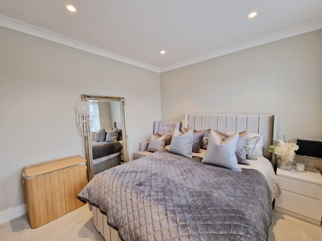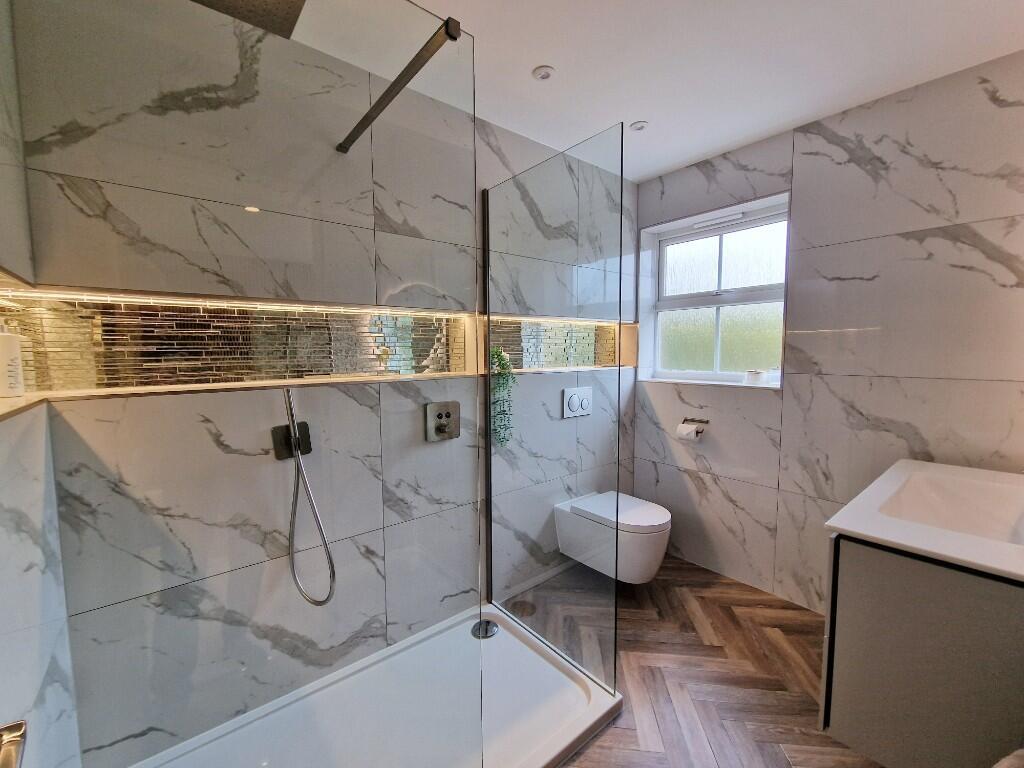 Ensuite:- - Obscure double glazed window to rear. Walk in shower with rain shower and hand held attachment. Built in LED illuminated shelving. Wall mounted low level wc with wall mounted push button flush. Wash basin over vanity unit with mixer tap. Tiled walls. Extractor fan. Heated towel rail.