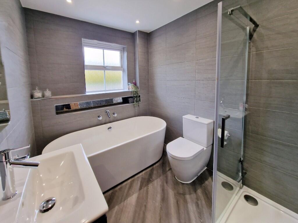 Family Bathroom:- - Obscure double glazed window to rear. Free standing bath with wall mounted AXOR bath filler. Inset shelving. Walk in shower with tiled surround and inset shelf. Rain shower and hand held attachment. Close coupled wc. Wash basin over vanity unit.