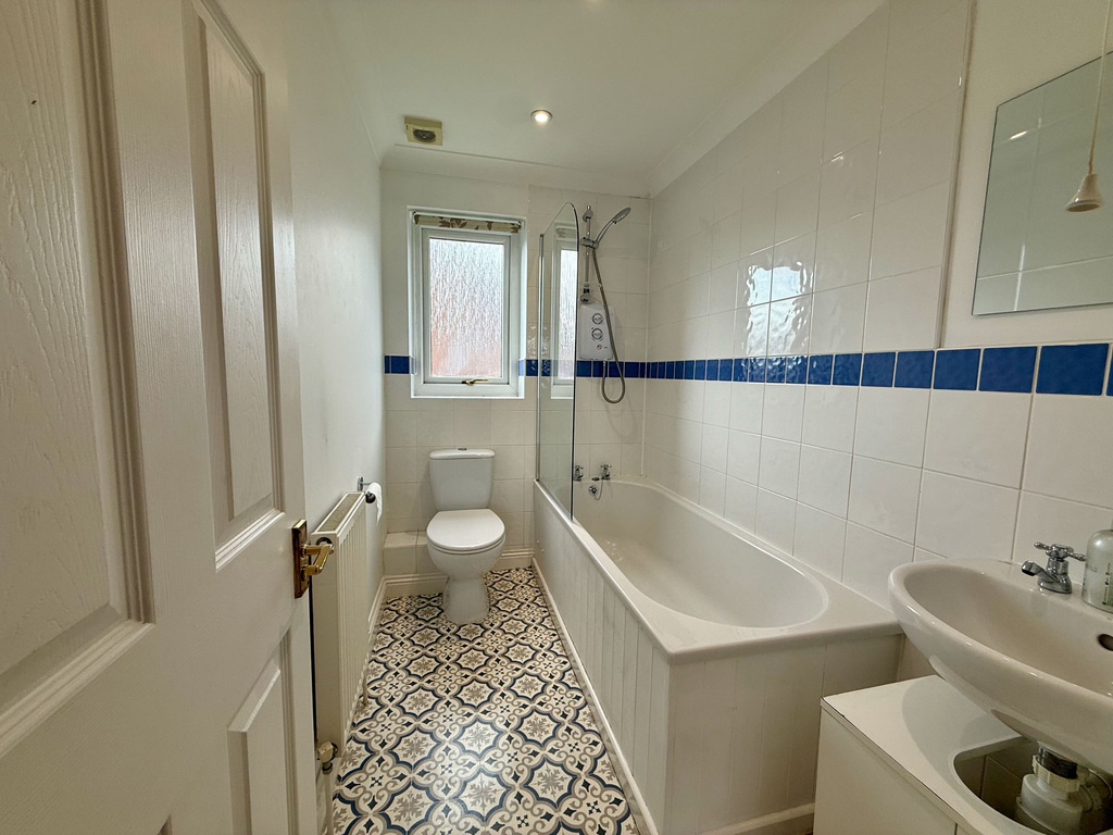 - Family bathroom fitted with a white suite which includes a panel bath with shower, WC, and wash hand basin.
