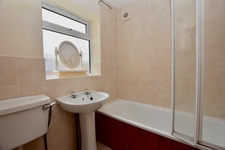 BATHROOM Window to side aspect. White suite comprising bath with shower over, WC and basin. Part tiled walls, tiled flooring, chrome ladder style towel radiator.