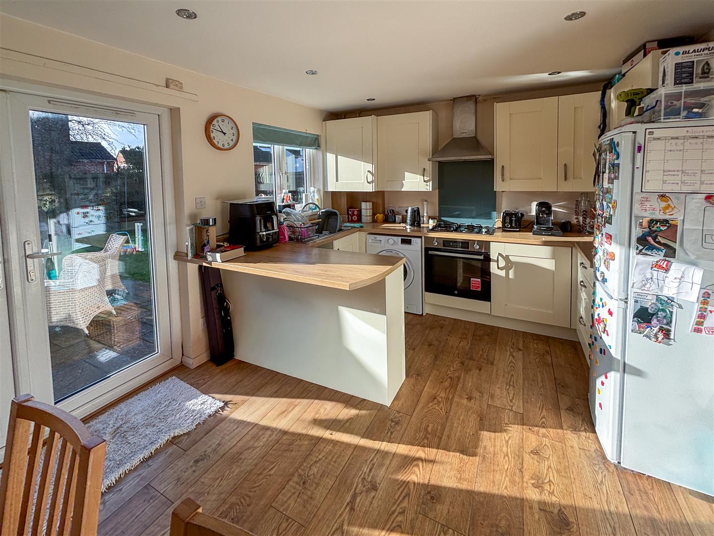 Kitchen / Dining Room - 14'11" x 10'08" - Double glazed window and double glazed french doors opening onto the rear garden. A range of wall and base units with work surface over and matching up stands, stainless steel sink inset, breakfast bar, built-in gas hob with extractor hood above and oven below, space and plumbing for automatic washing machine, radiator.