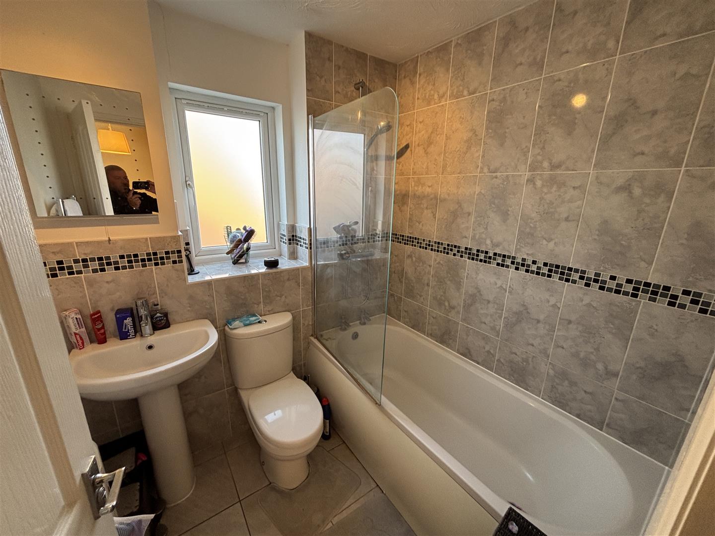 Bathroom - Obscure double glazed window to side. A white suite comprising a panelled bath with tiled surrounds and a glazed screen, low level W.C, pedestal wash hand basin, heated towel rail.