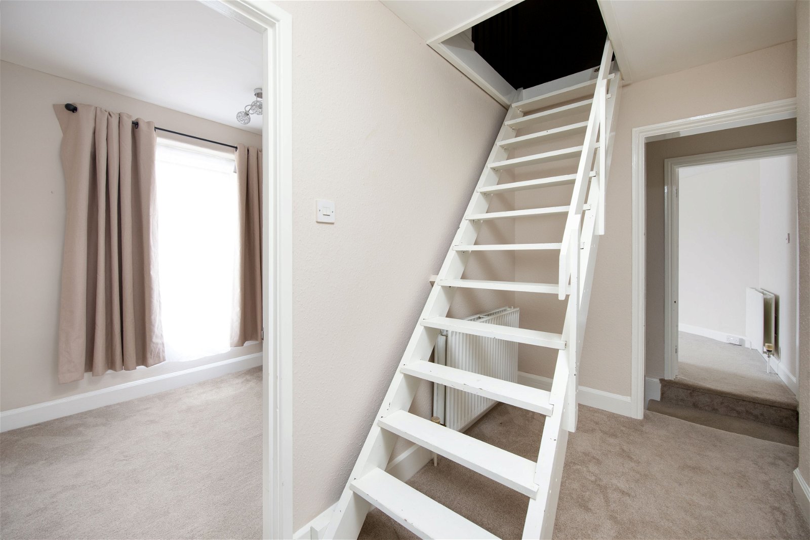 Head up the stairs and the two bedrooms can be found. The master bedroom, measuring 13’’ x 10’2’’ provides plenty of space for a double bed, bedside table, and wardrobes. The second bedroom is also large enough for a double bed and has the added benefit of built in wardrobes. A staircase to the second floor takes you to the surprisingly spacious loft room which could be used as a work from home office, additional reception room or storage space.