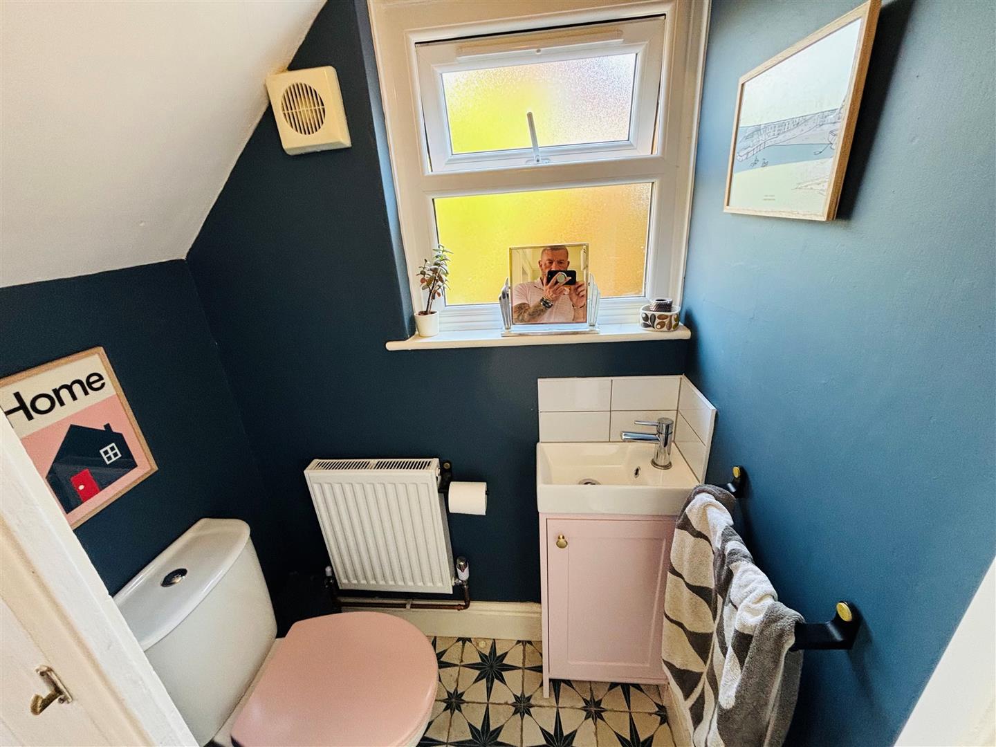 Cloakroom - Window to side, low level W.C, wall mounted wash hand basin with tiled splash backs, extractor fan.