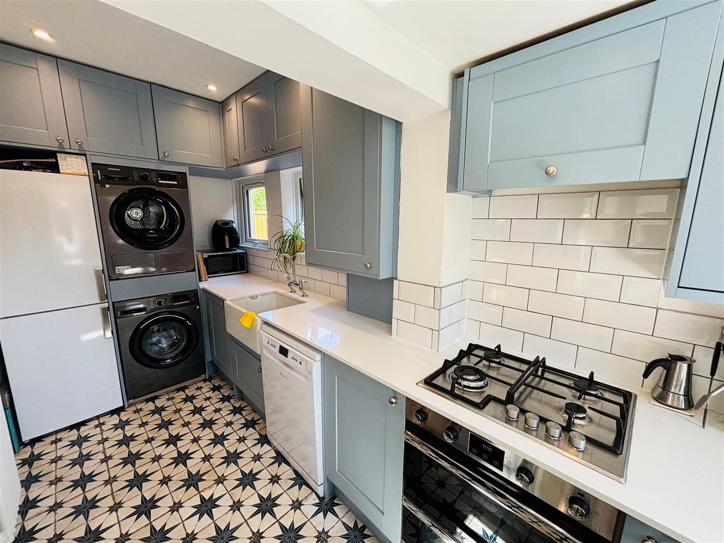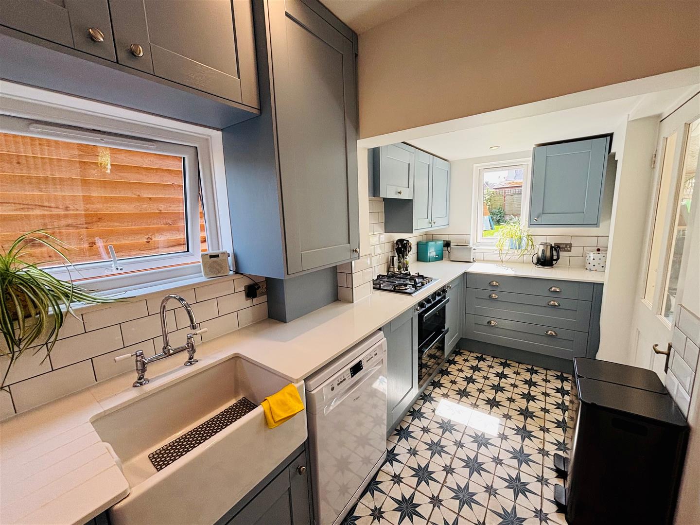 Fitted Kitchen - 15'05" x 6'02" - Double glazed window to rear and two further glazed windows to side. A range of wall and base units with work surface over, Belfast sink, and quartz effect work tops, tiled splash backs, built-in gas hob with oven below and extractor above, wall mounted gas boiled, space and plumbing for washing machine and dishwasher, door to sunroom.
