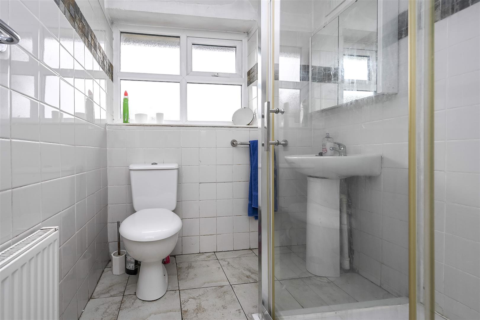 Shower Room - shower cubicle with Triton electric shower, pedestal wash hand basin, low level w.c, tiled floor, tiled walls, radiator, double glazed window