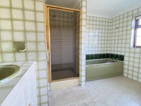 Bathroom 7' 8" x 8' 9" (2.34m x 2.67m) plus alcove Fitted with a panelled bath, tiled shower cubicle, low level WC, vanity basin, radiator, uPVC double glazed window and fully tiled walls.