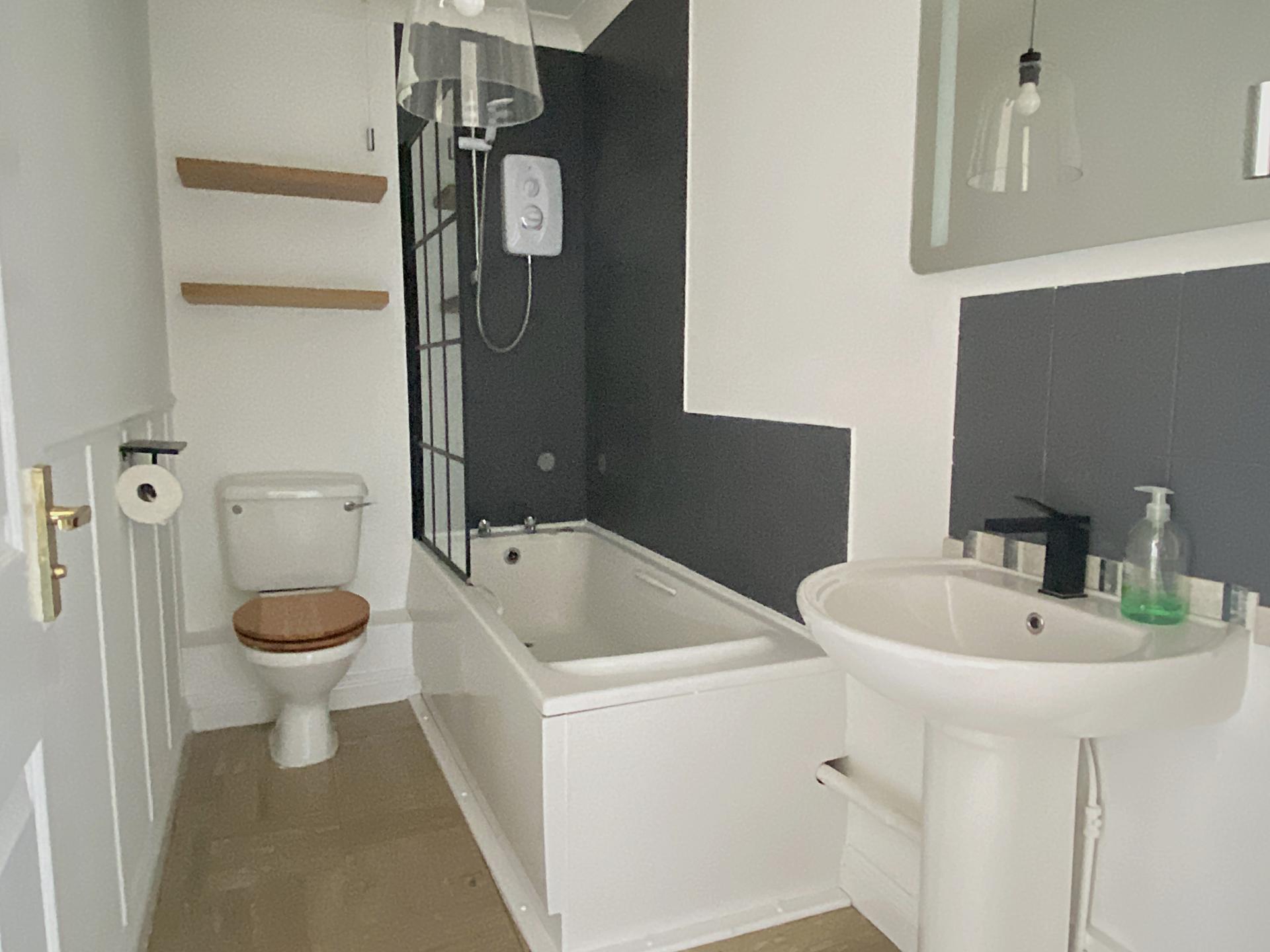 Bathroom 9' 5" x 4' 8" (2.87m x 1.42m) Fitted with a three-piece suite comprising panelled bath with taps and electric shower over with screen, pedestal basin and mixer tap, low level WC, part tiled part panelled walls, extractor fan.