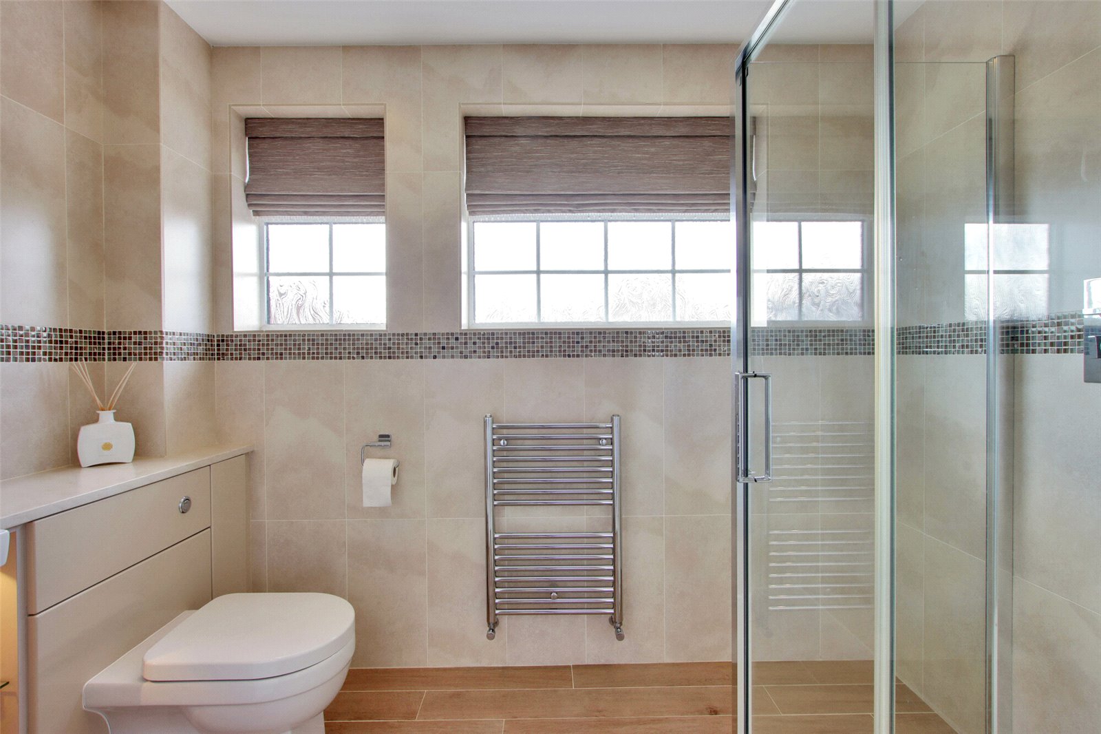 Shower Room 8'8" x 5'6" (2.64m x 1.68m). Two Georgian style frosted windows to rear. Wood effect tiled flooring. Plain ceiling with downlights. Heated towel rail. Shower cubicle. Wash hand basin. Low level W.C.