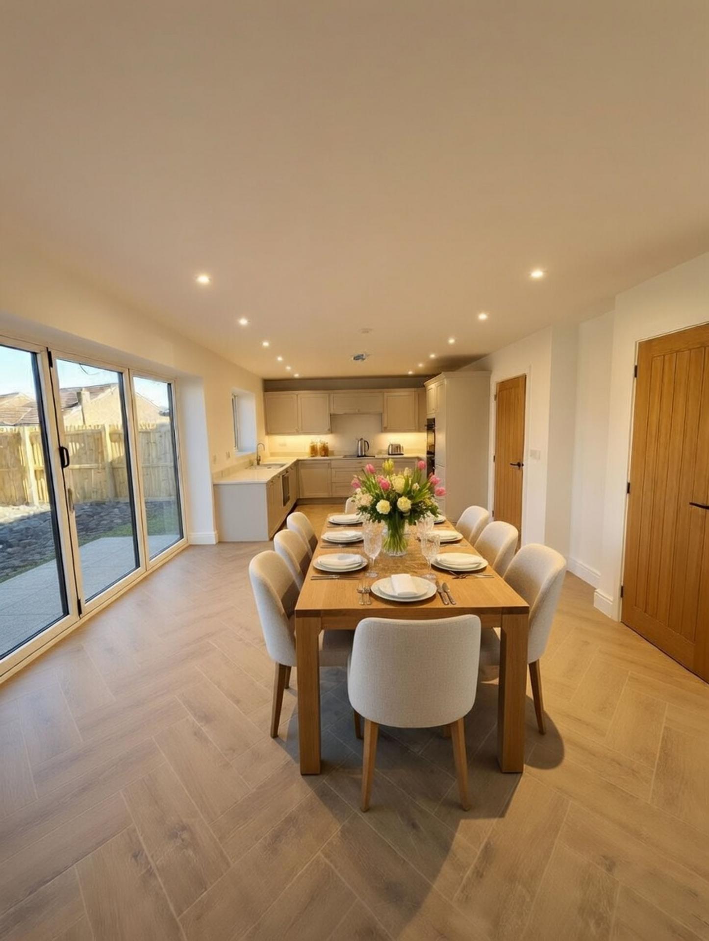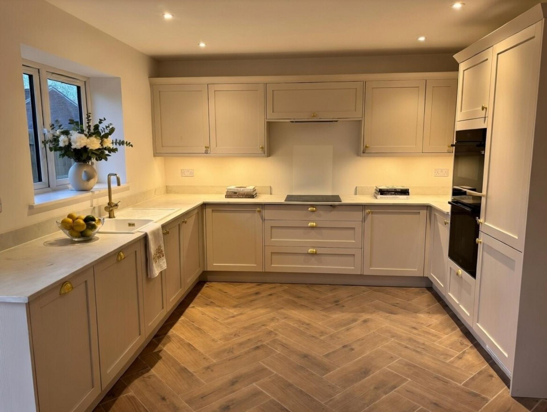 The heart of the home is a superb open-plan living space, thoughtfully designed for modern family living, featuring bi-fold doors that open seamlessly onto the private rear garden — creating an effortless indoor-to-outdoor flow ideal for entertaining. The living area transitions smoothly into a beautifully appointed luxury shaker style kitchen, fitted with quality Samsung integrated appliances. Underfloor heating throughout the ground floor further enhances comfort and efficiency. A convenient utility area and downstairs WC are accessed off the main hallway.
