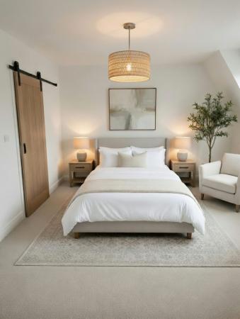 To the first floor, a stunning landing — also finished with a sleek glass balustrade — leads to two well-proportioned bedrooms and a stylish family bathroom, with the principal bedroom benefiting from its own contemporary en-suite shower room. Both the family bathroom and en-suite are finished to a high standard and feature modern wall-mounted sink units, enhancing the clean, contemporary aesthetic. Each bedroom benefits from useful storage within the eaves, maximising practicality while maintaining clean internal lines.