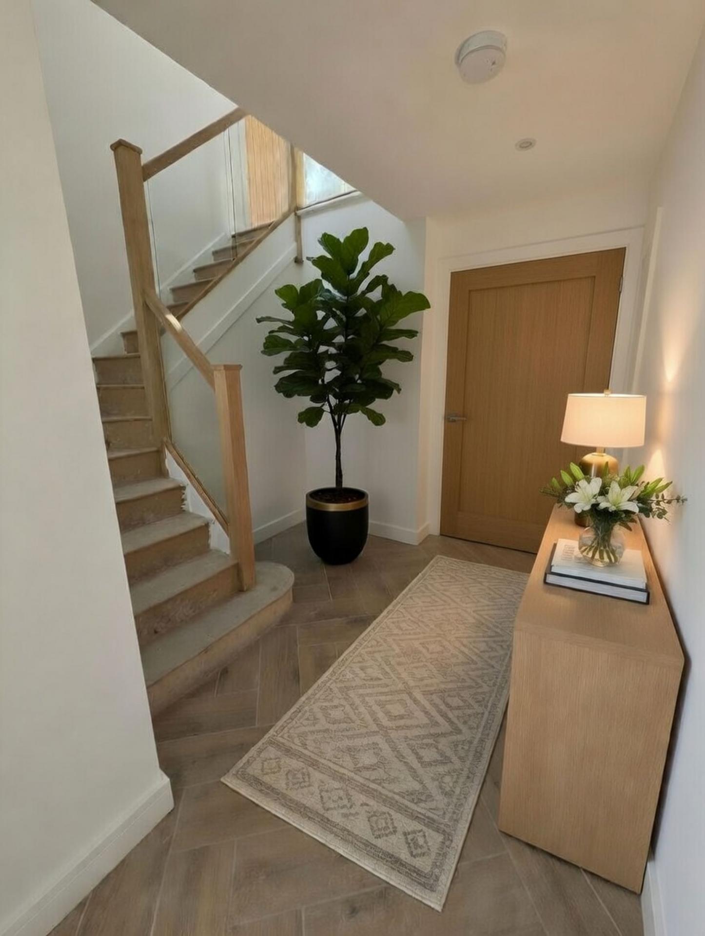 The property is entered via an inviting central reception hallway, beautifully finished with tasteful herringbone wooden plank tiling, a contemporary glass balustrade staircase, creating an immediate sense of light and space. A front-facing reception room provides excellent flexibility which can serve as a third bedroom, home office playroom, seperate dining/lounge space.