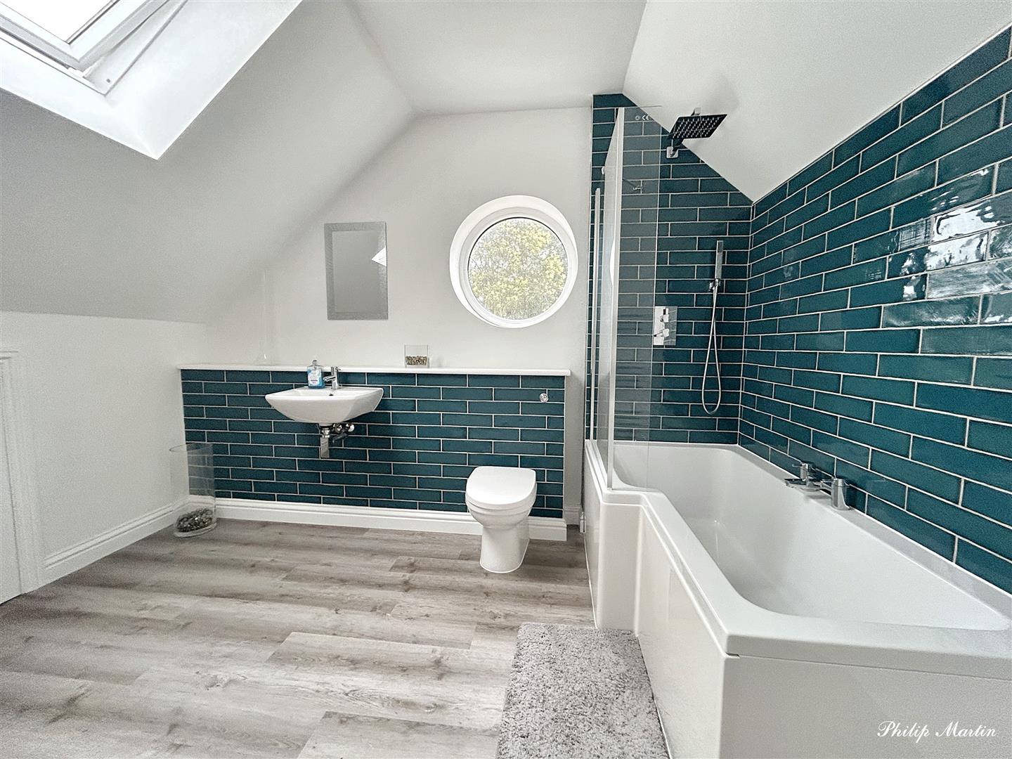 Bathroom - Another large bathroom with white suite including panel bath with fully tiled surround, shower screen, and shower over. Low level w.c., wash hand basin. Velux window. Heated towel rail. Feature circular window to front enjoying countryside views. Heated towel rail. Large walk in storage cupboard and further storage in eaves.