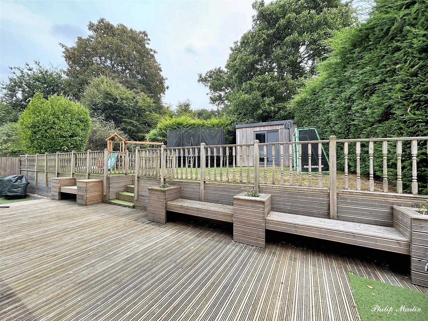 Rear Garden - A very private garden that enjoys the sun for the majority of the day. Large deck accessed from the kitchen/breakfast room and sitting room providing lots of sitting out space for entertaining and alfresco dining. Alongside the house is a wide enclosed gravelled space, ideal for clothes drying and storage. There are outside lights. Steps lead from the terrace to a level lawned garden that is enclosed within dense hedge boundaries, providing privacy and protection. Bespoke summer house, ideal as a home office, insulated with sliding French doors.