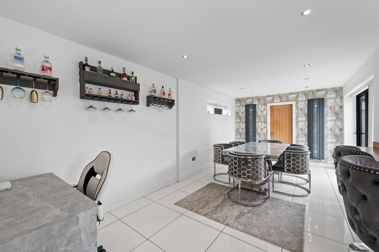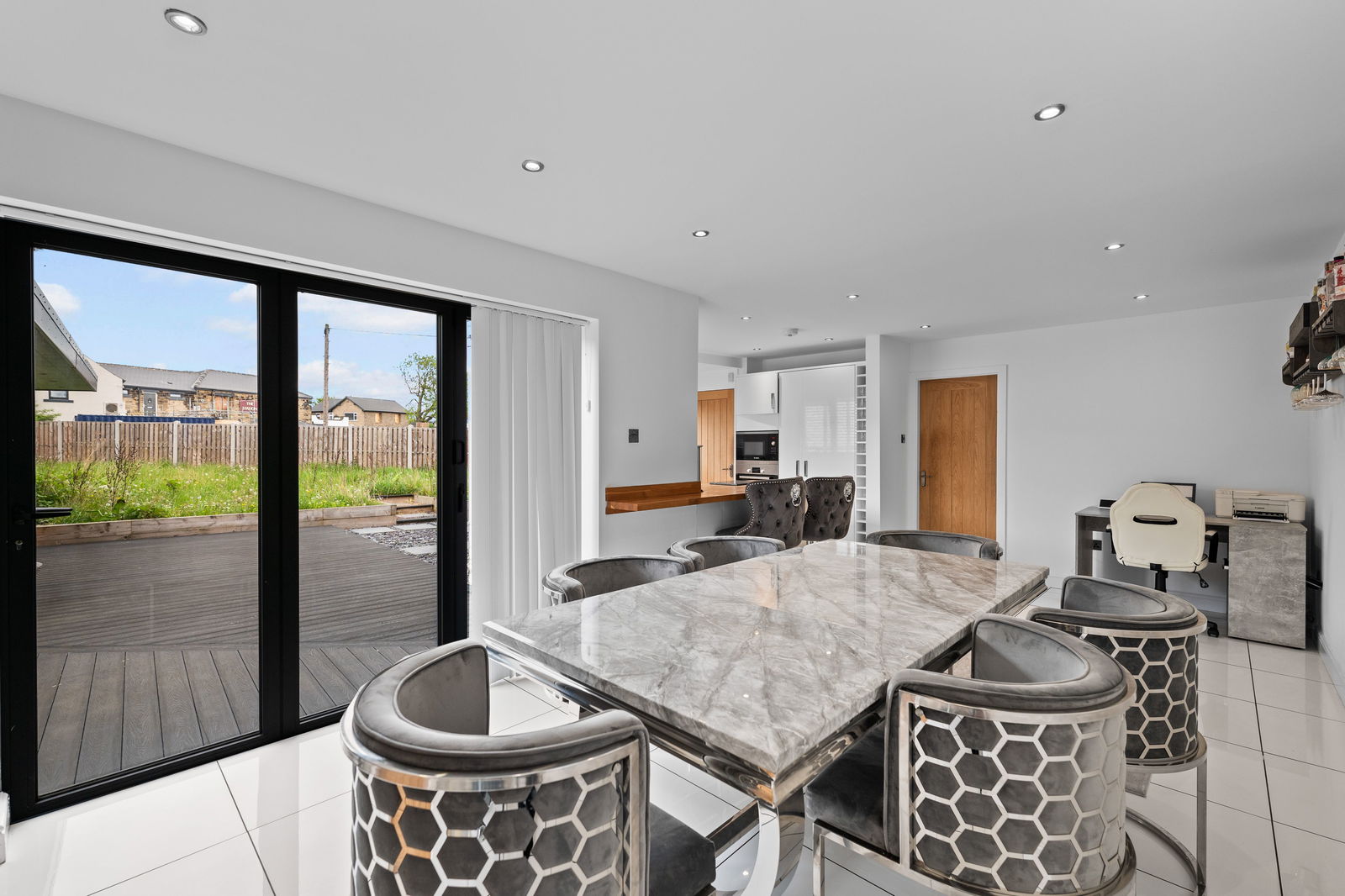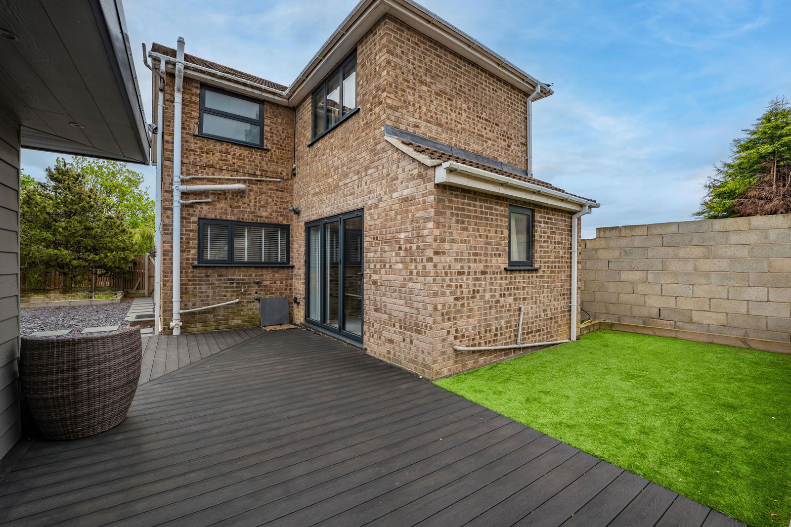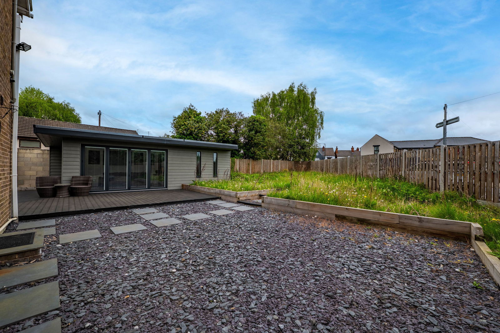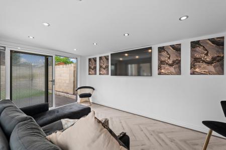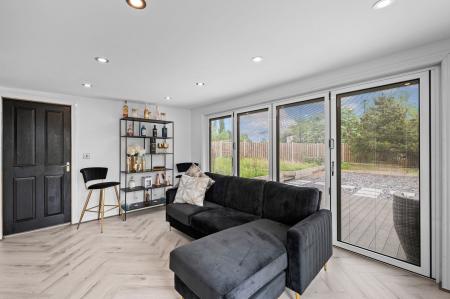 A REAL STANDOUT IS THE IMPRESSIVE OUTBUILDING/SUMMERHOUSE, cleverly designed with two versatile rooms and a sleek, contemporary finish—perfect for use as a bar, home office, gym, or guest space.