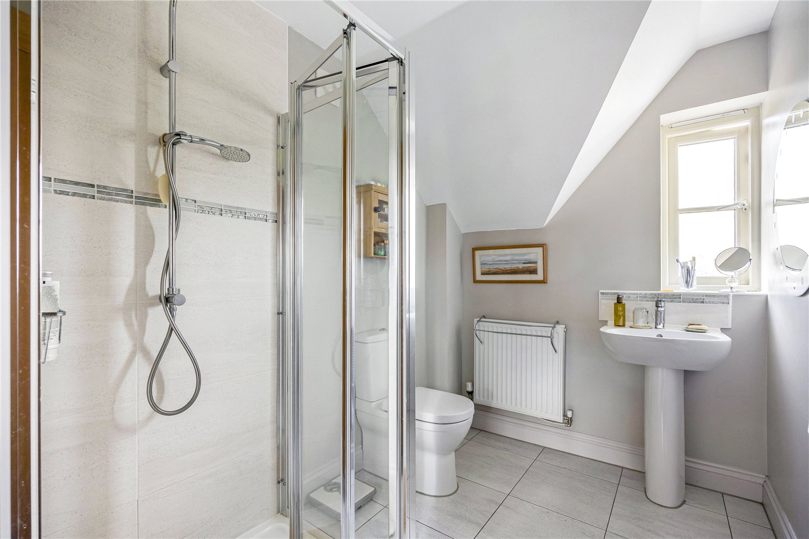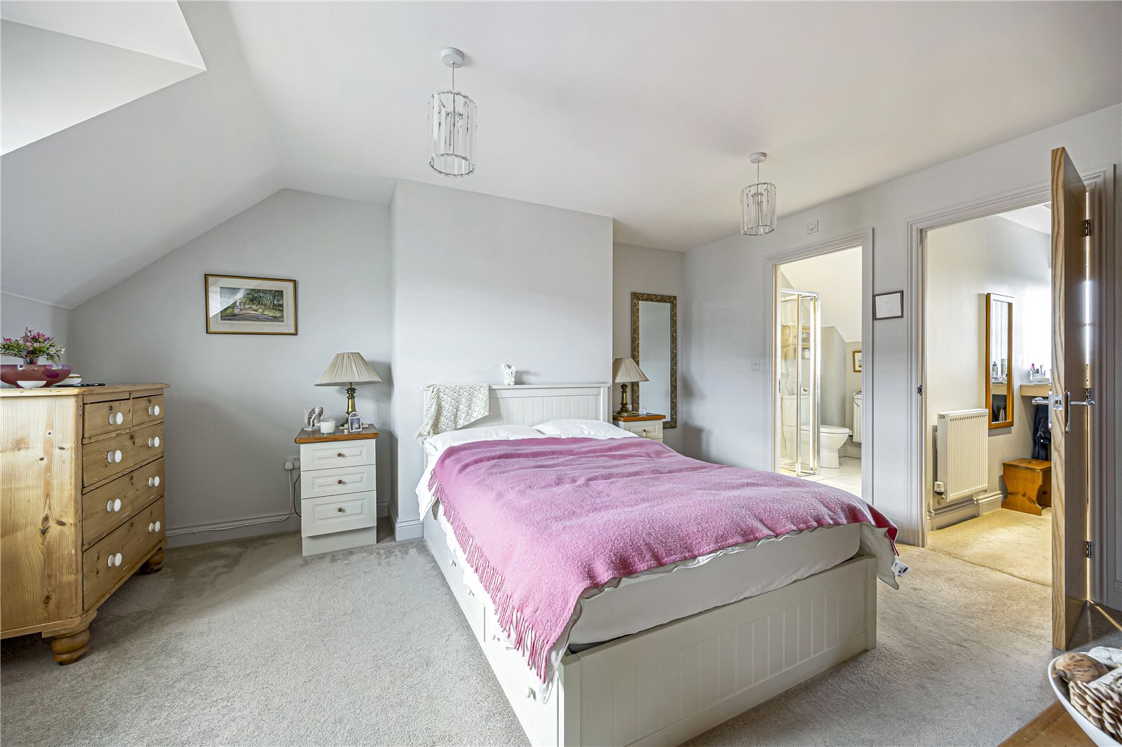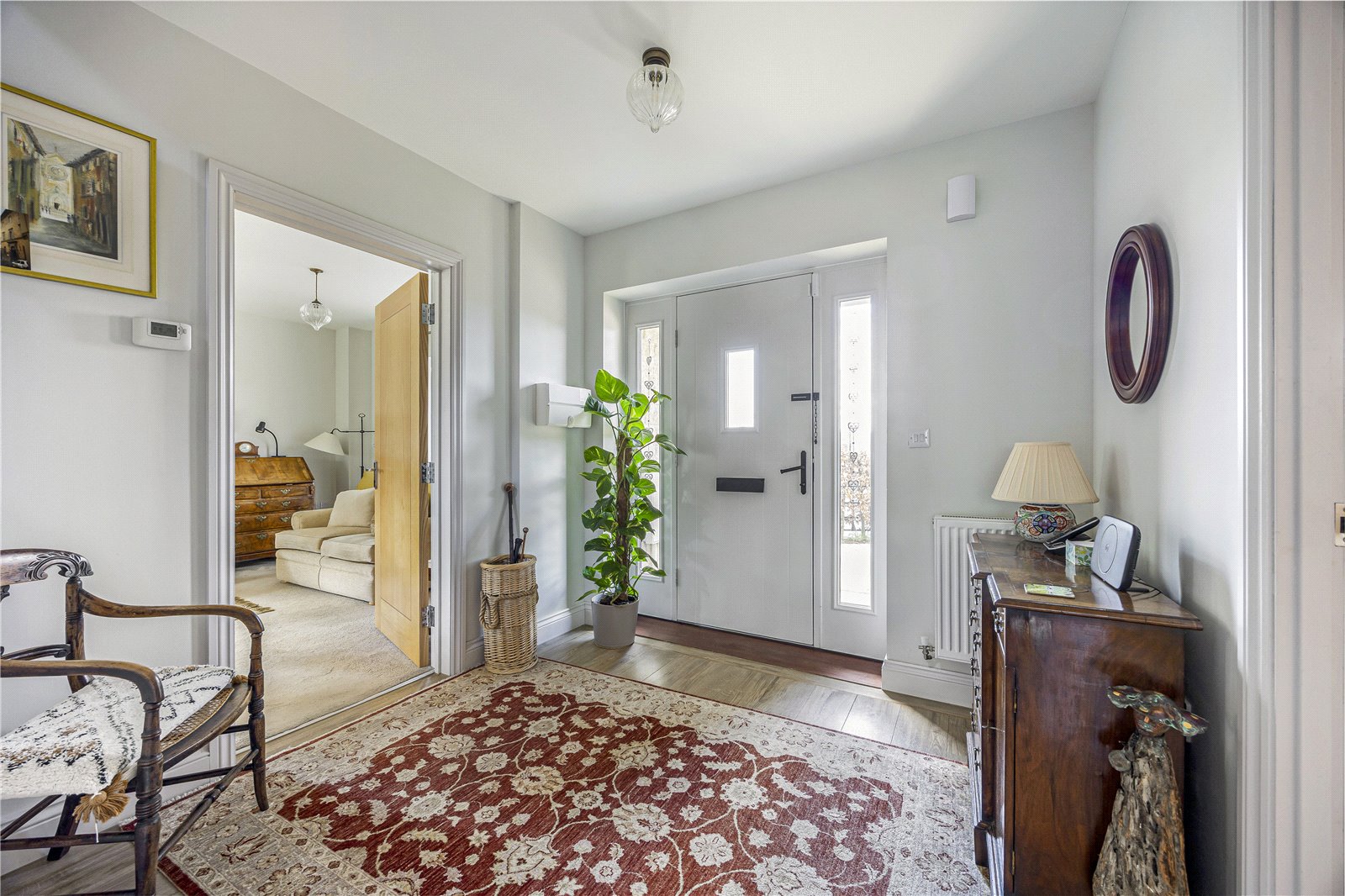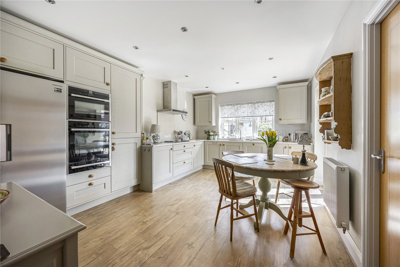 To the first floor, there are four generous double bedrooms. The principal bedroom benefits from a stylish en-suite shower room and a useful walk-in wardrobe. The remaining bedrooms are served by a well-equipped family bathroom, comprising a bath, separate shower cubicle, WC, and wash basin.