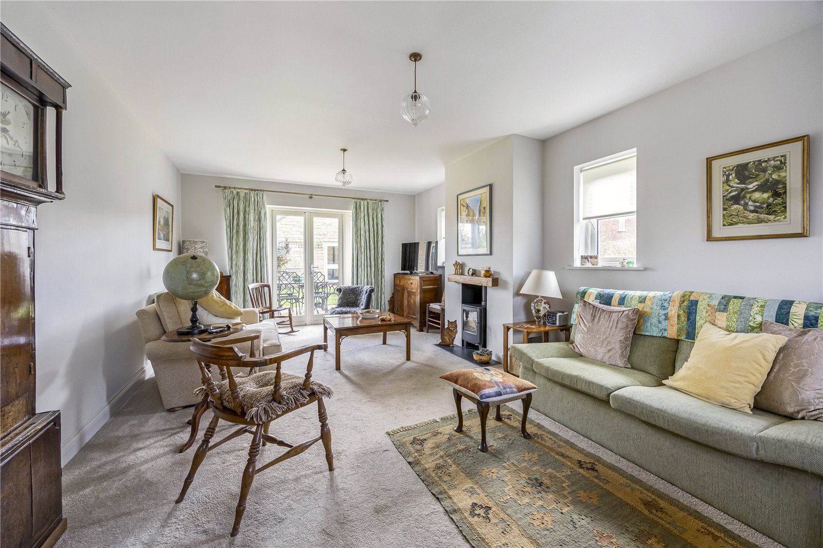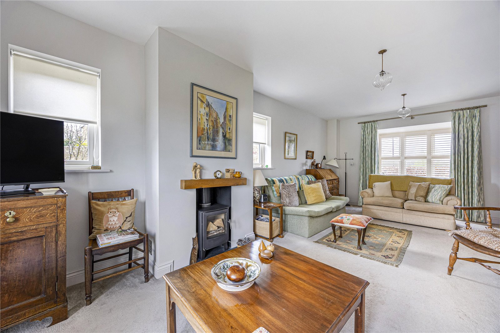 The well-proportioned accommodation briefly comprises a welcoming entrance hallway with stairs rising to the first floor and access to all principal ground floor rooms. The impressive sitting room spans the full depth of the property, benefitting from triple-aspect windows, including a box bay to the front and patio doors opening onto the rear garden, with a feature wood-burning stove creating a central focal point.