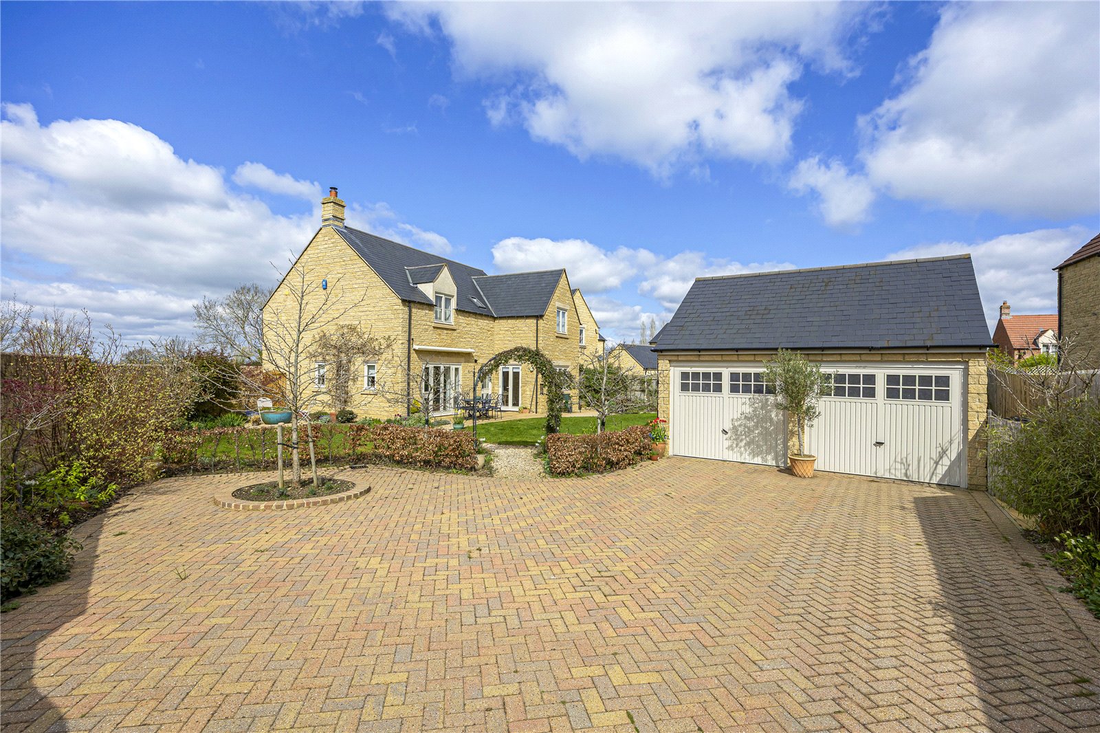 The beautifully landscaped rear garden features a patio seating area and two well-maintained lawns, complemented by well-stocked borders. A charming winding gravel pathway leads to a spacious block-paved driveway and a double garage with power and lighting, all securely enclosed by remote-controlled double gates. The front garden is designed for low maintenance, being predominantly laid to stone chippings with a pathway leading to the property.