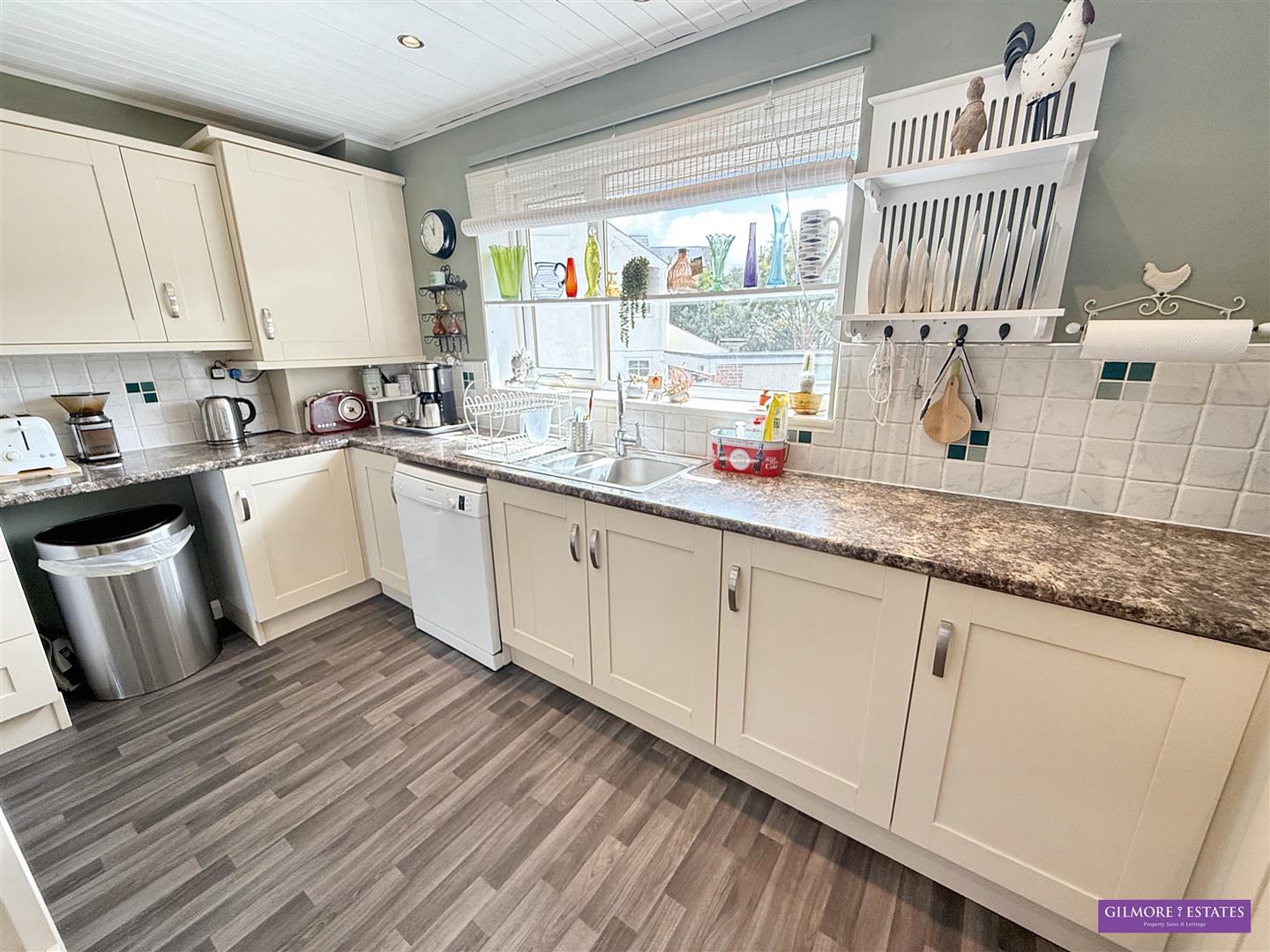 Kitchen - 4.22m x 3.35m - Wall and base units with glossy laminate work surfaces, electric cooker with stainless steel chimney extractor and splash back, plumbed for washing machine, 1.5 stainless steel sink and drainer unit with mixer tap, cupboard housing combi boiler, serving hatch to dining room, Upvc window to rear.