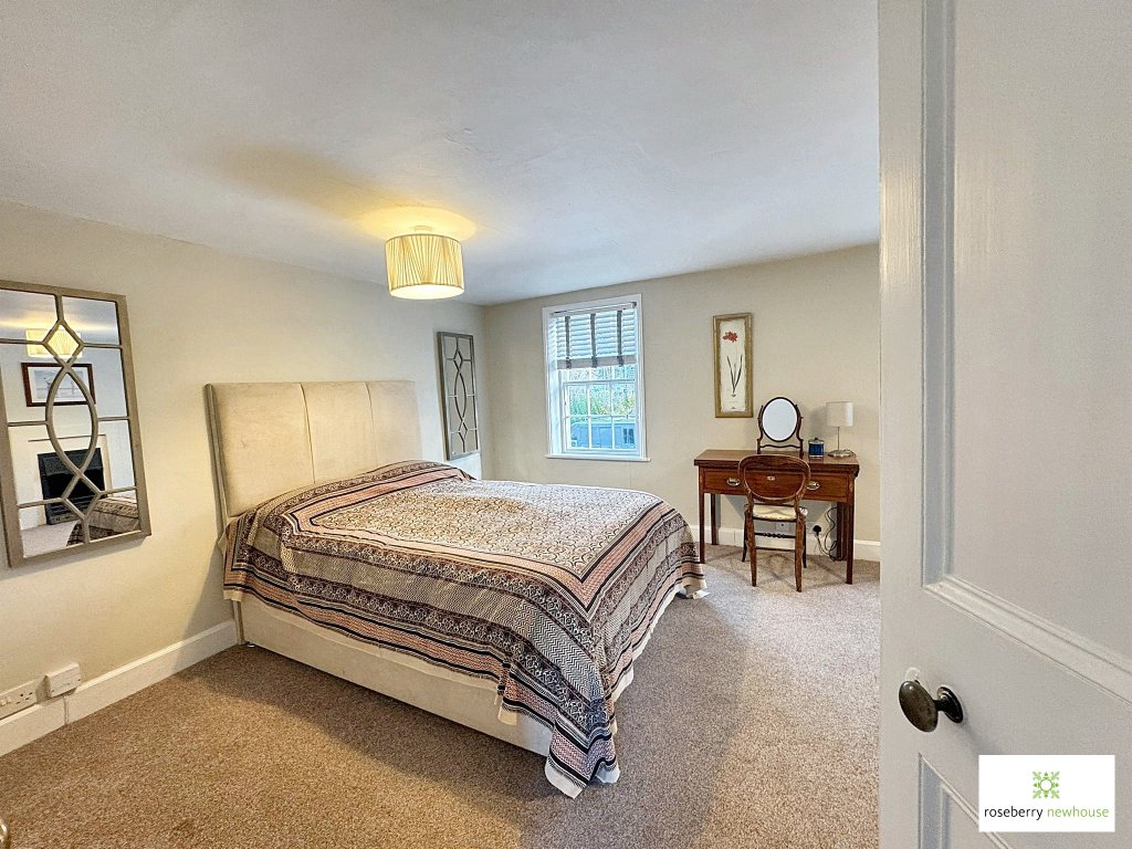 Upstairs, the first floor accommodates a spacious principal bedroom with another beautiful period fireplace, formerly two separate rooms and now offering generous proportions and flexibility. A modern bathroom with contemporary fittings serves the floor, while stairs lead to a delightful attic room, complete with exposed beams and a Velux window drawing in natural light—an ideal study, studio or occasional bedroom.
