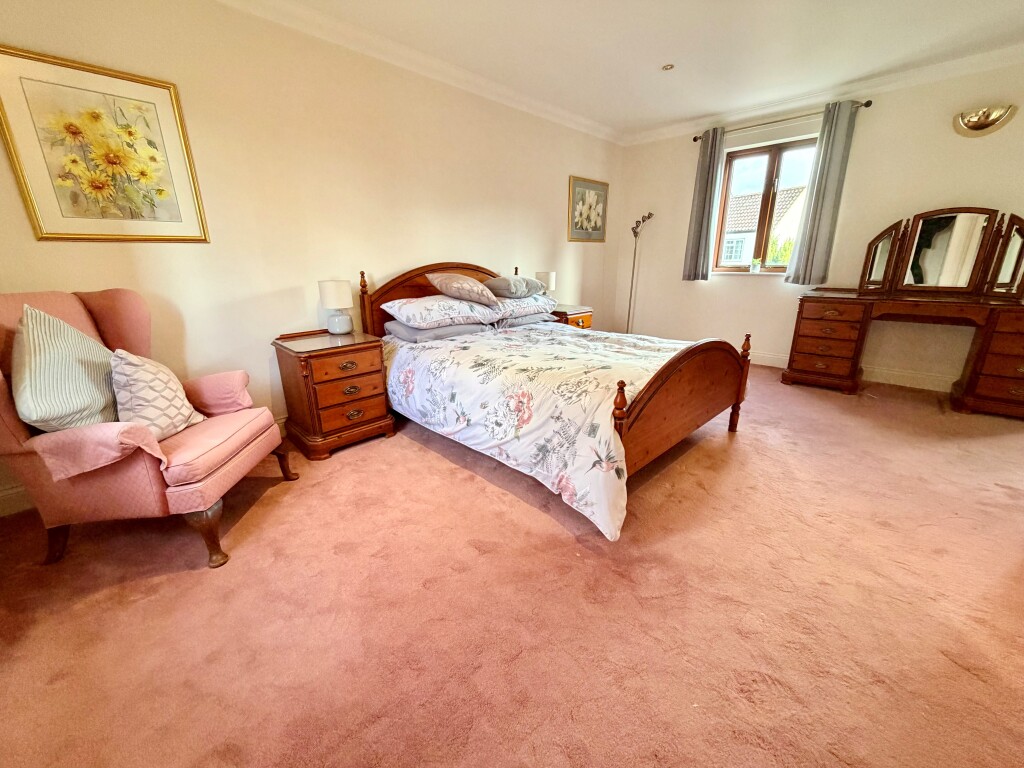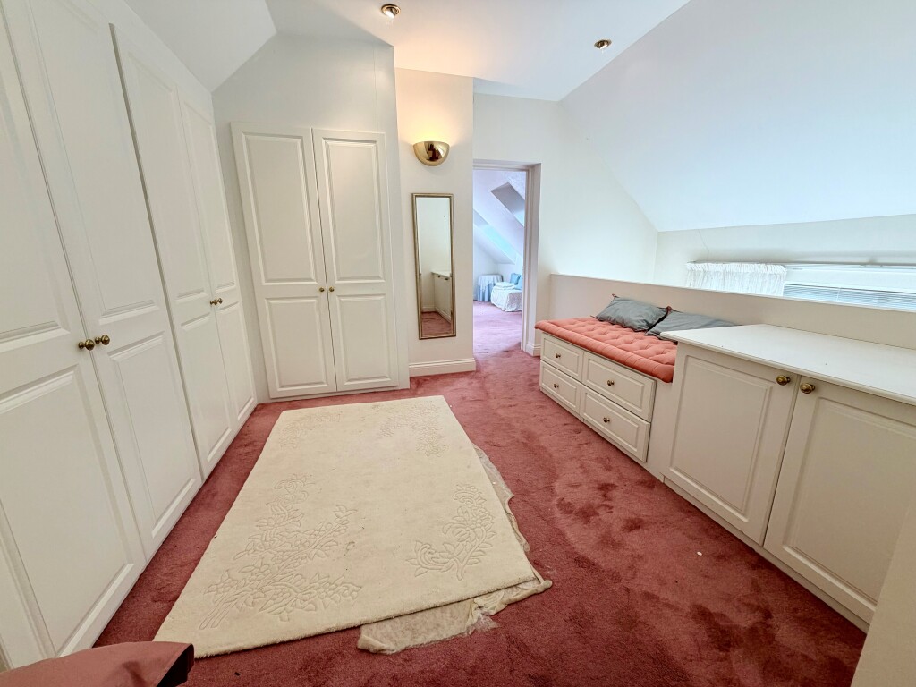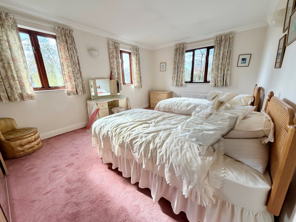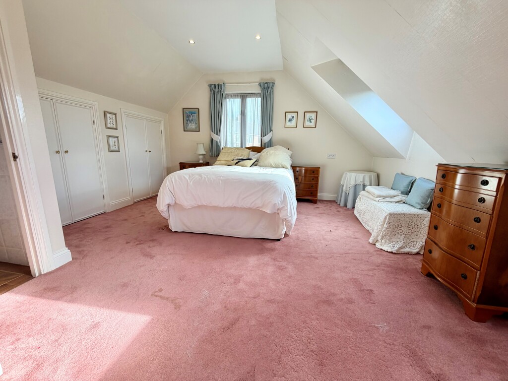 Upstairs, the principal bedroom enjoys fitted storage and a private en-suite shower room. A superb guest suite adds a touch of drama with its galleried dressing room and en-suite, while two further bedrooms are served by the family bathroom—perfectly set up for visiting friends, growing families or flexible home working.