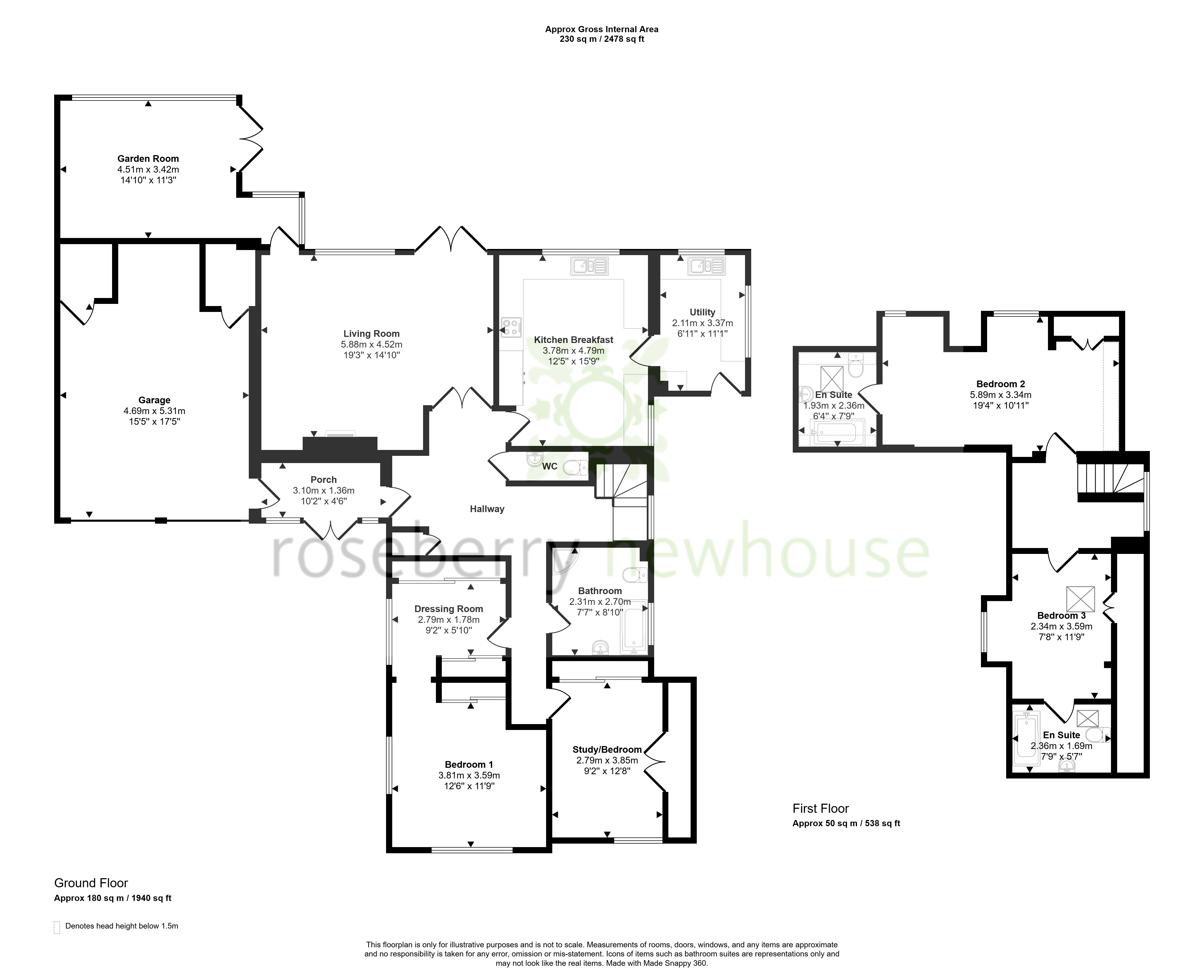 To the first floor are two further double bedrooms, each benefiting from their own en suite facilities, creating ideal guest accommodation or private suites for family members.