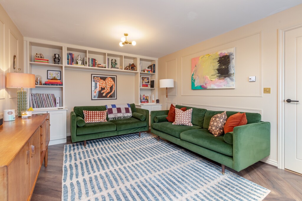 Upstairs, the principal bedroom includes fitted storage and an en suite shower room, while the guest bedroom also benefits from its own en suite—ideal for visiting family or an older child. Two further well-balanced double bedrooms are served by a stylish family bathroom. Outside, block-paved parking sits in front of the single garage, and to the rear a neatly landscaped, south-westerly garden offers a broad stone terrace and level lawn edged with planting—perfect for play, entertaining and quiet evenings as the sun sets across the open outlook.