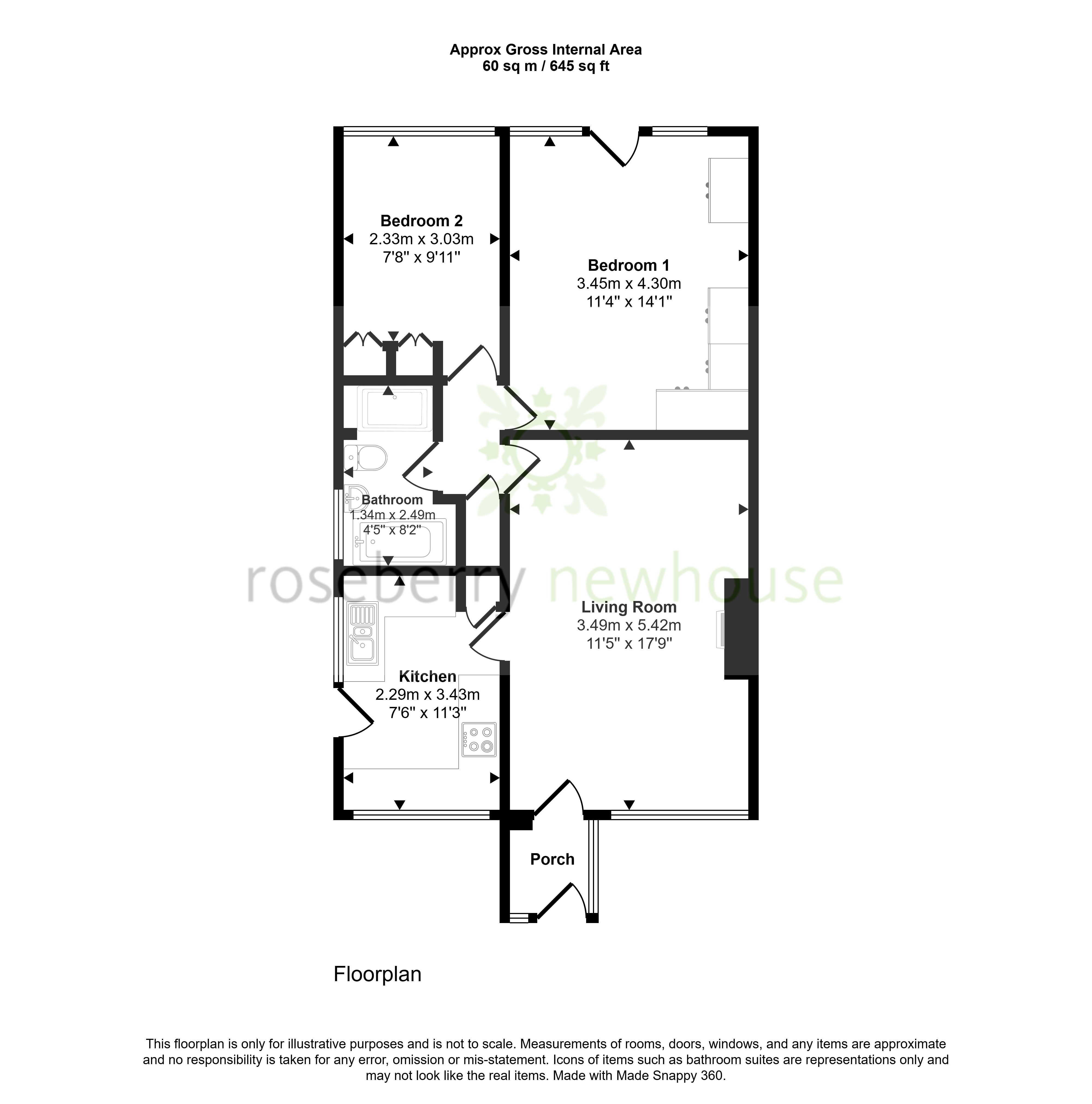 A glazed entrance vestibule opens to a generous living room, naturally bright and arranged around a feature fireplace. The modern kitchen sits to the rear with good worktop space and fitted cabinetry, perfectly placed for easy access to the garden. Two comfortable bedrooms are served by a well-appointed bathroom featuring a separate shower.
