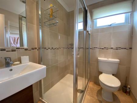 Good sized en-suite shower room having inset spot lighting, heated towel rail, tiled flooring, three piece suite comprising of a pedestal wash hand basin with mixer tap and complimentary splash back tiling, walk in shower cubicle housing a mixer shower with glazed sliding door, uPvc high level double glazed panelled frosted window to the rear elevation.