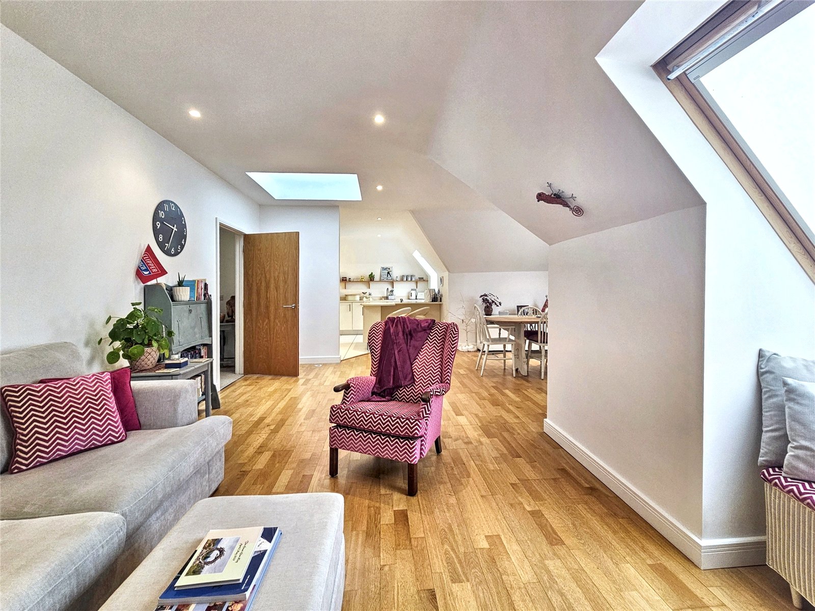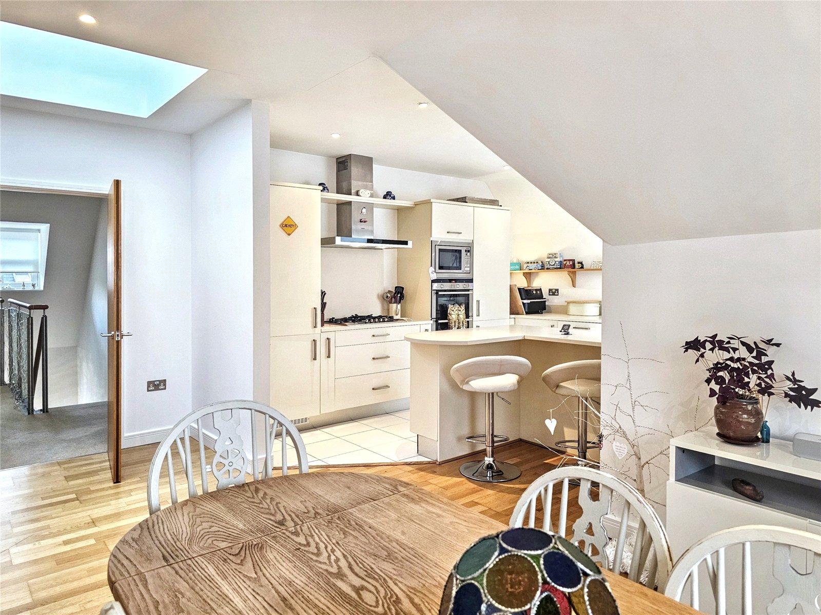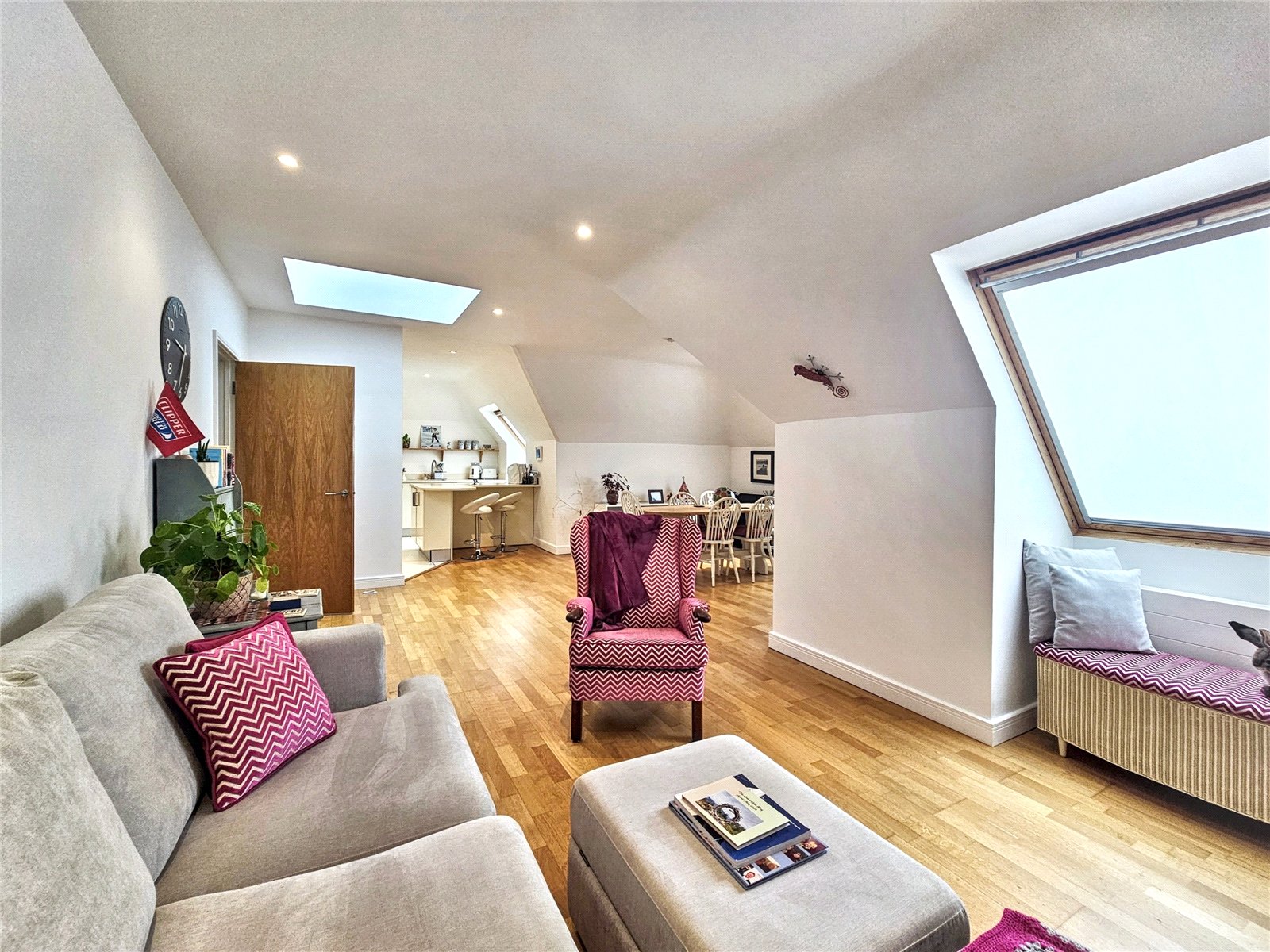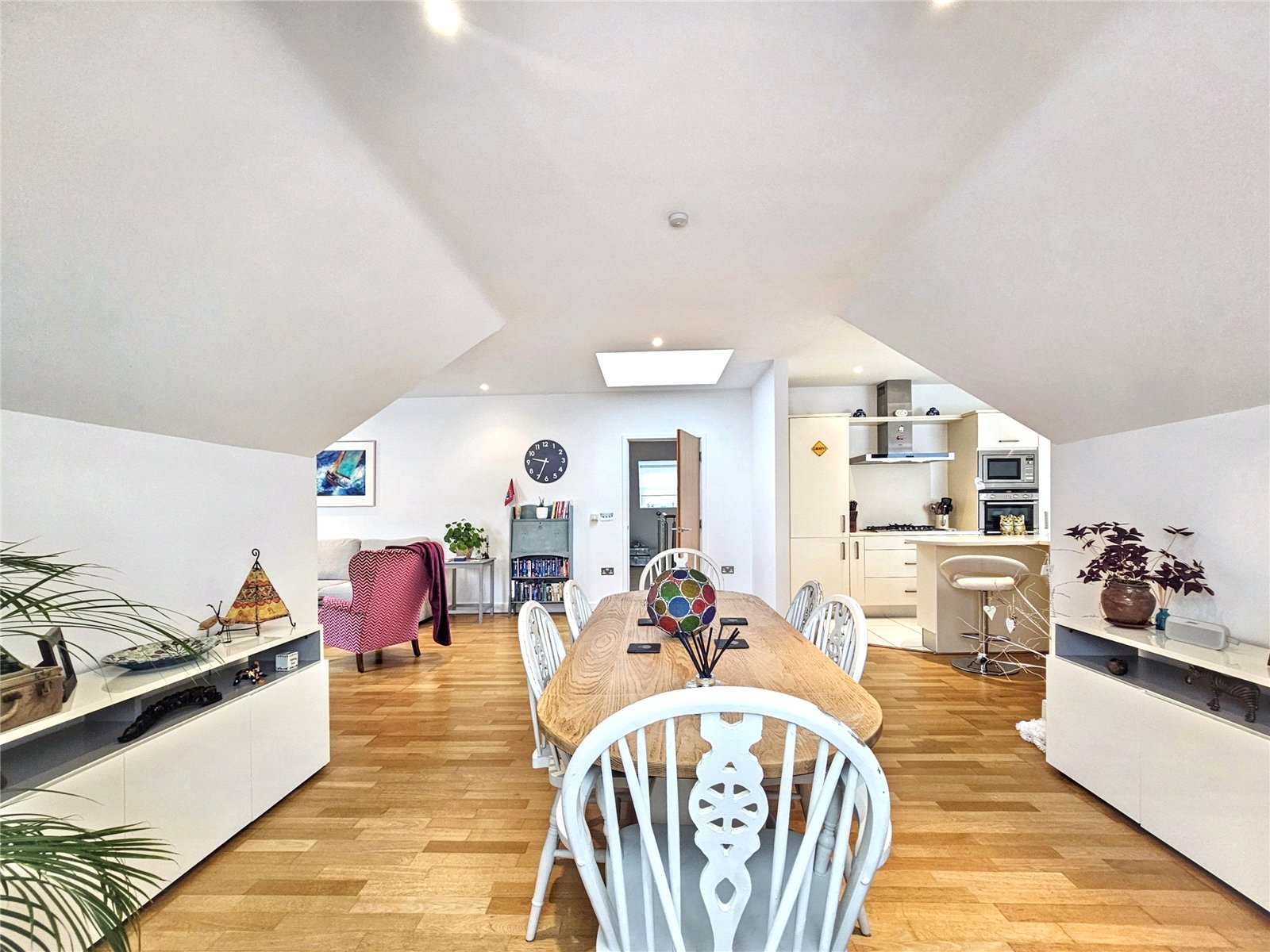 The open-plan living room/kitchen is a stunning area in which to entertain, being over 34' in length and with its roof light as well as three further Velux style westerly facing windows, is a bright and pleasing place to live. The kitchen area is fitted with a modern range of wall and base units with quality worksurfaces and a comprehensive range of fitted appliances. The peninsular breakfast bar is a delightful place to share a coffee with friends or indeed to work from home. The contemporary wooden flooring complements the elegance of the room.