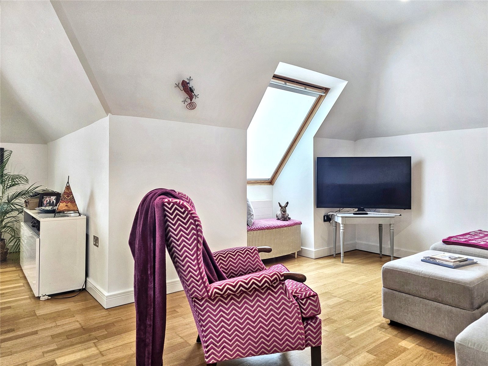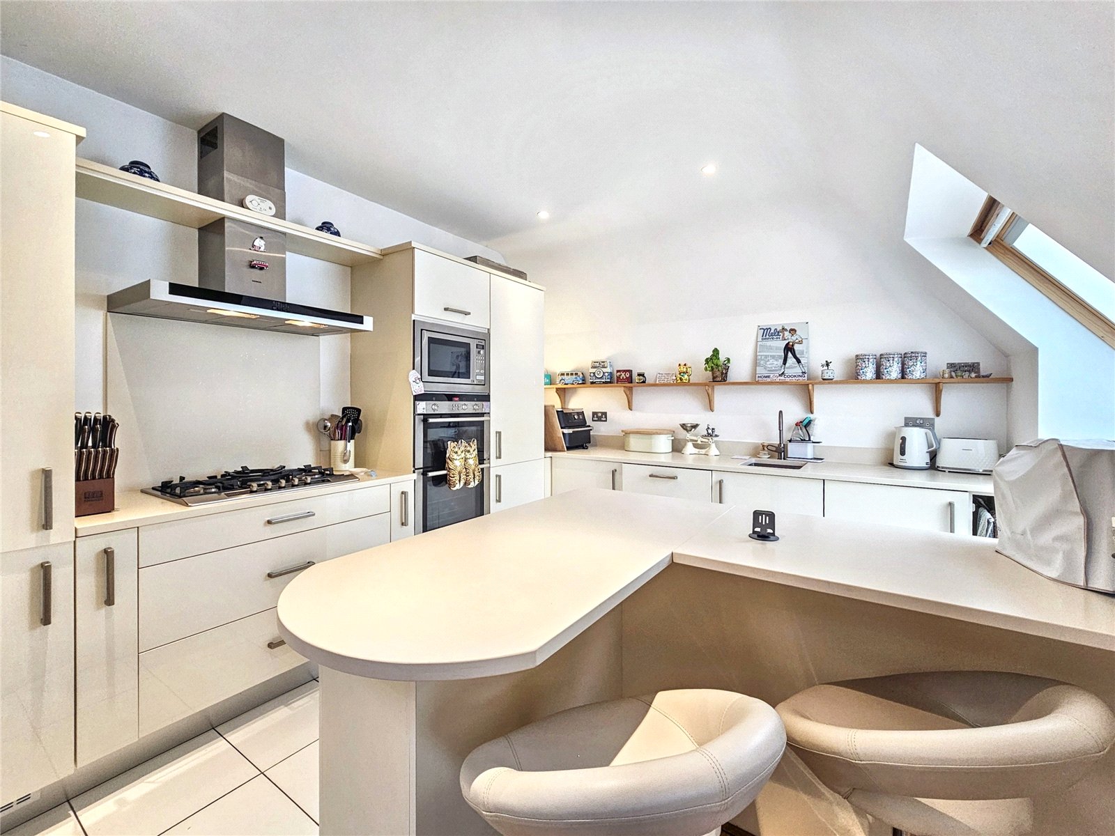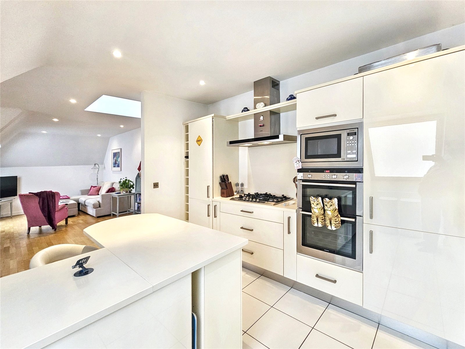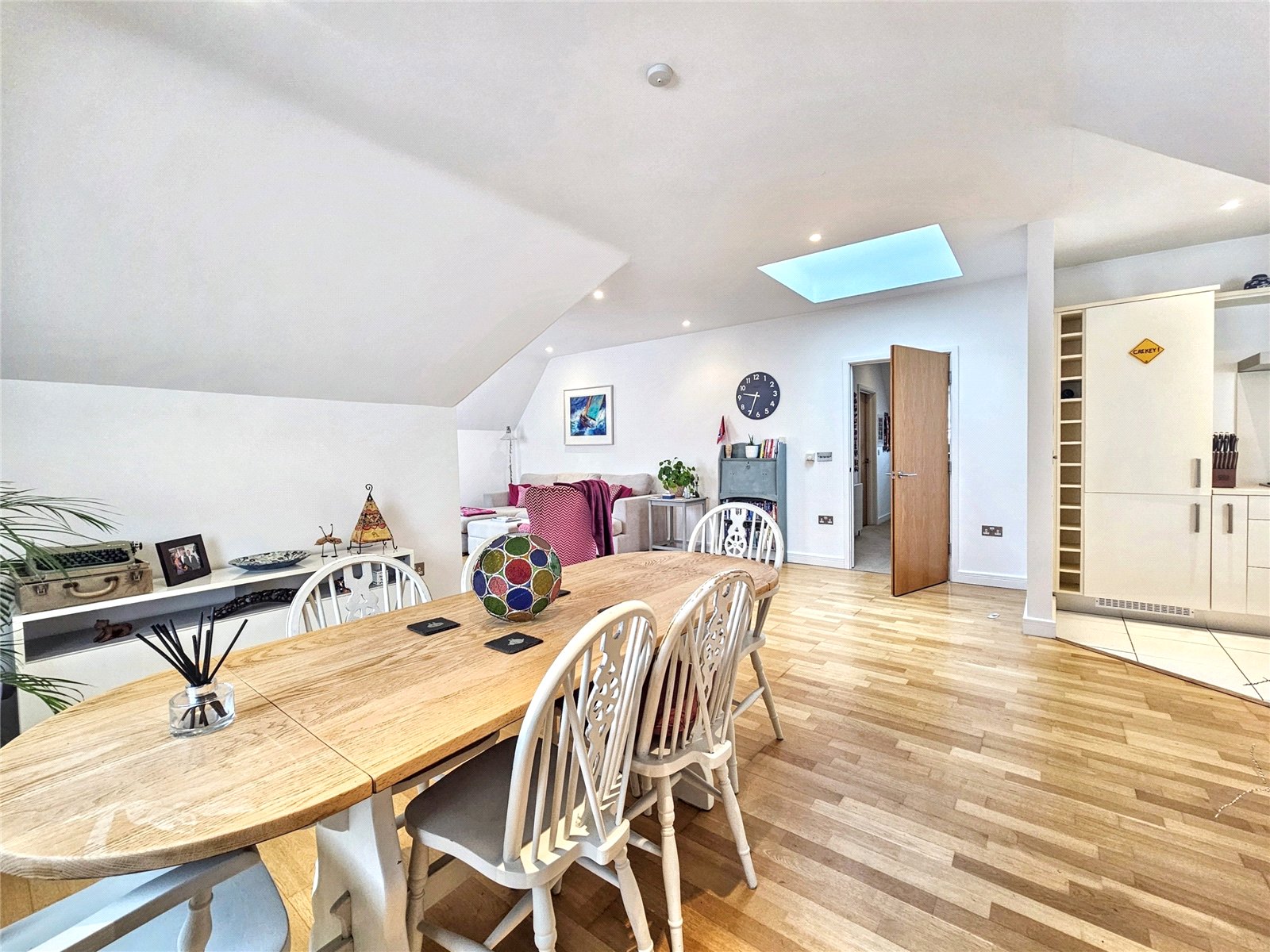 The open-plan living room/kitchen is a stunning area in which to entertain, being over 34' in length and with its roof light as well as three further Velux style westerly facing windows, is a bright and pleasing place to live. The kitchen area is fitted with a modern range of wall and base units with quality worksurfaces and a comprehensive range of fitted appliances. The peninsular breakfast bar is a delightful place to share a coffee with friends or indeed to work from home. The contemporary wooden flooring complements the elegance of the room.