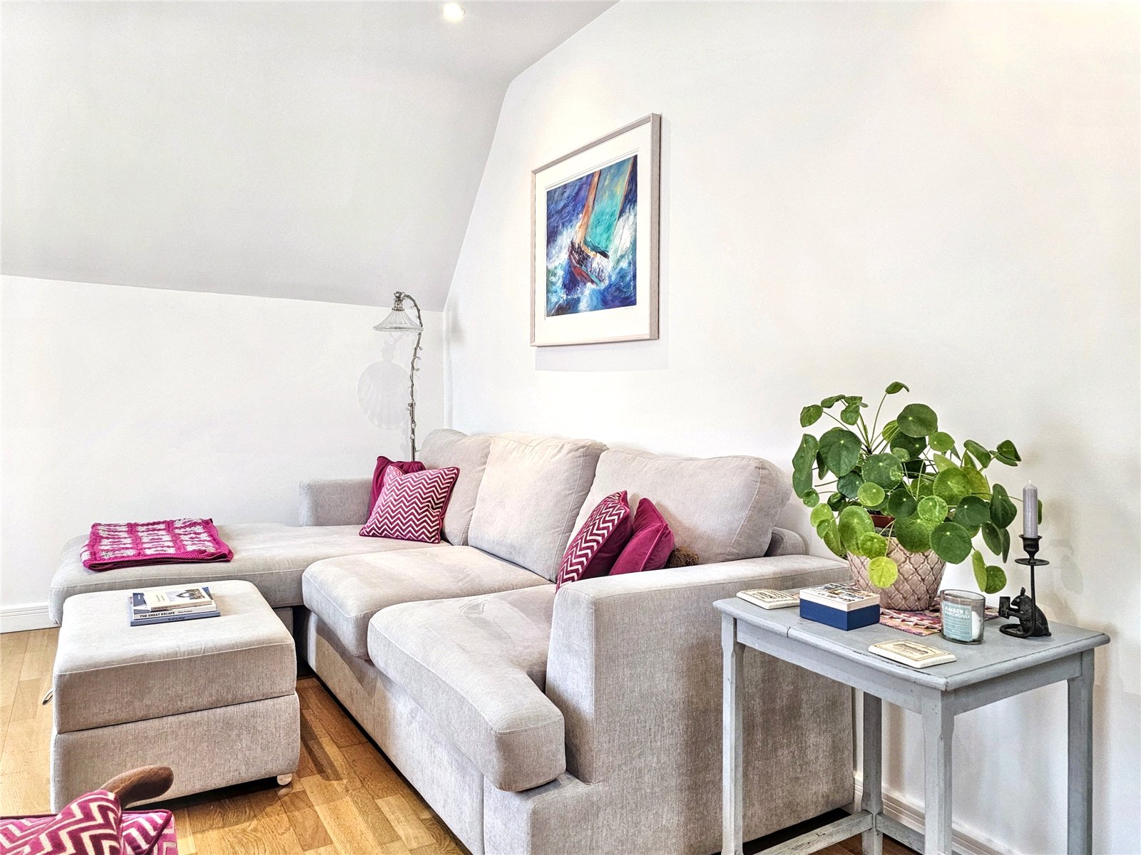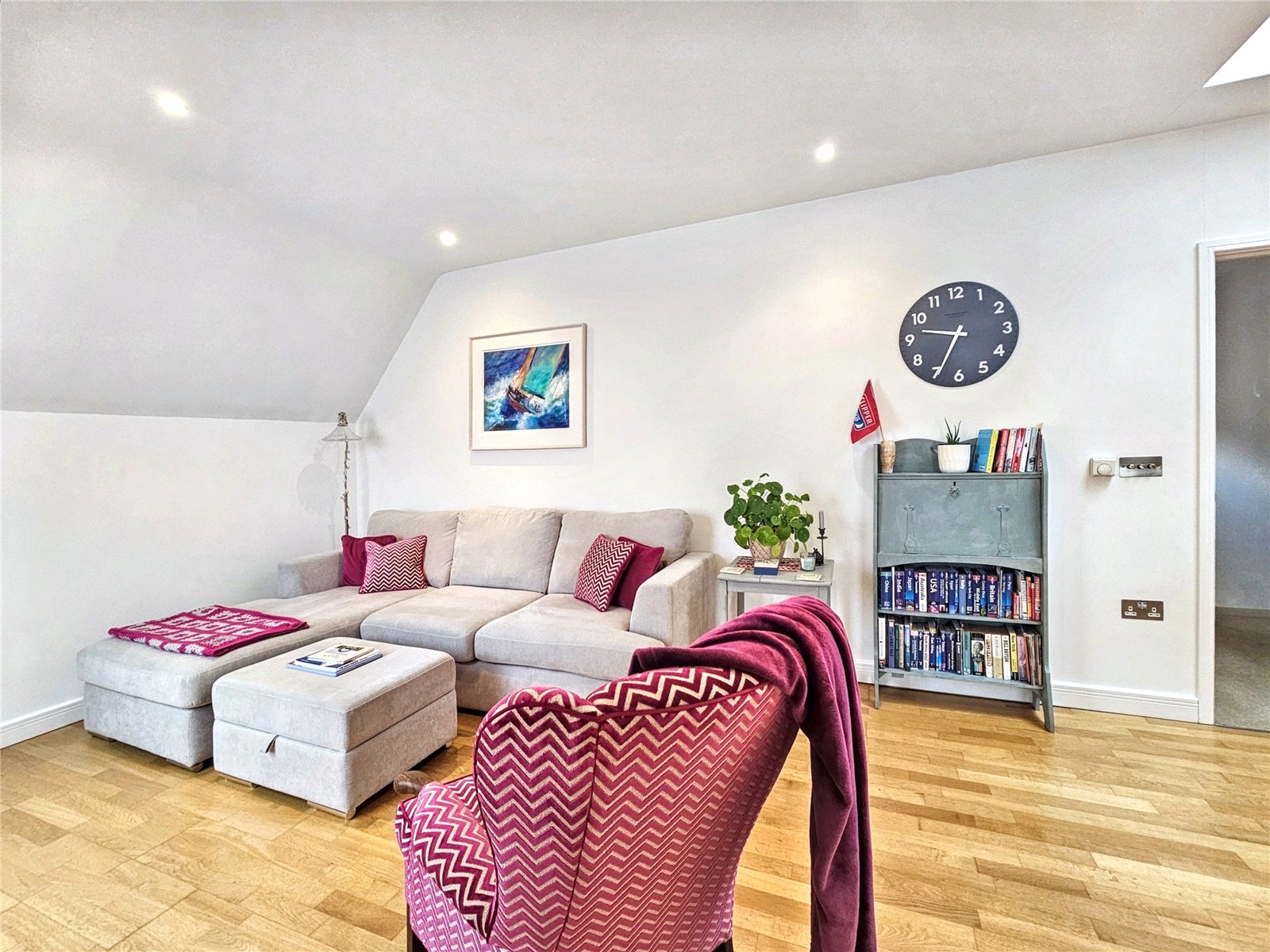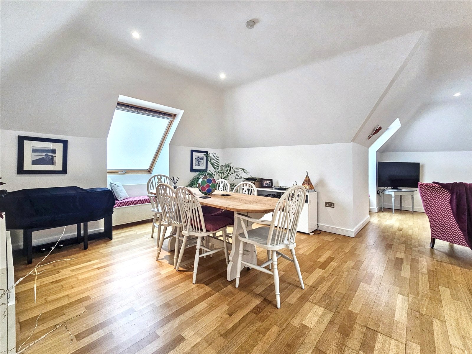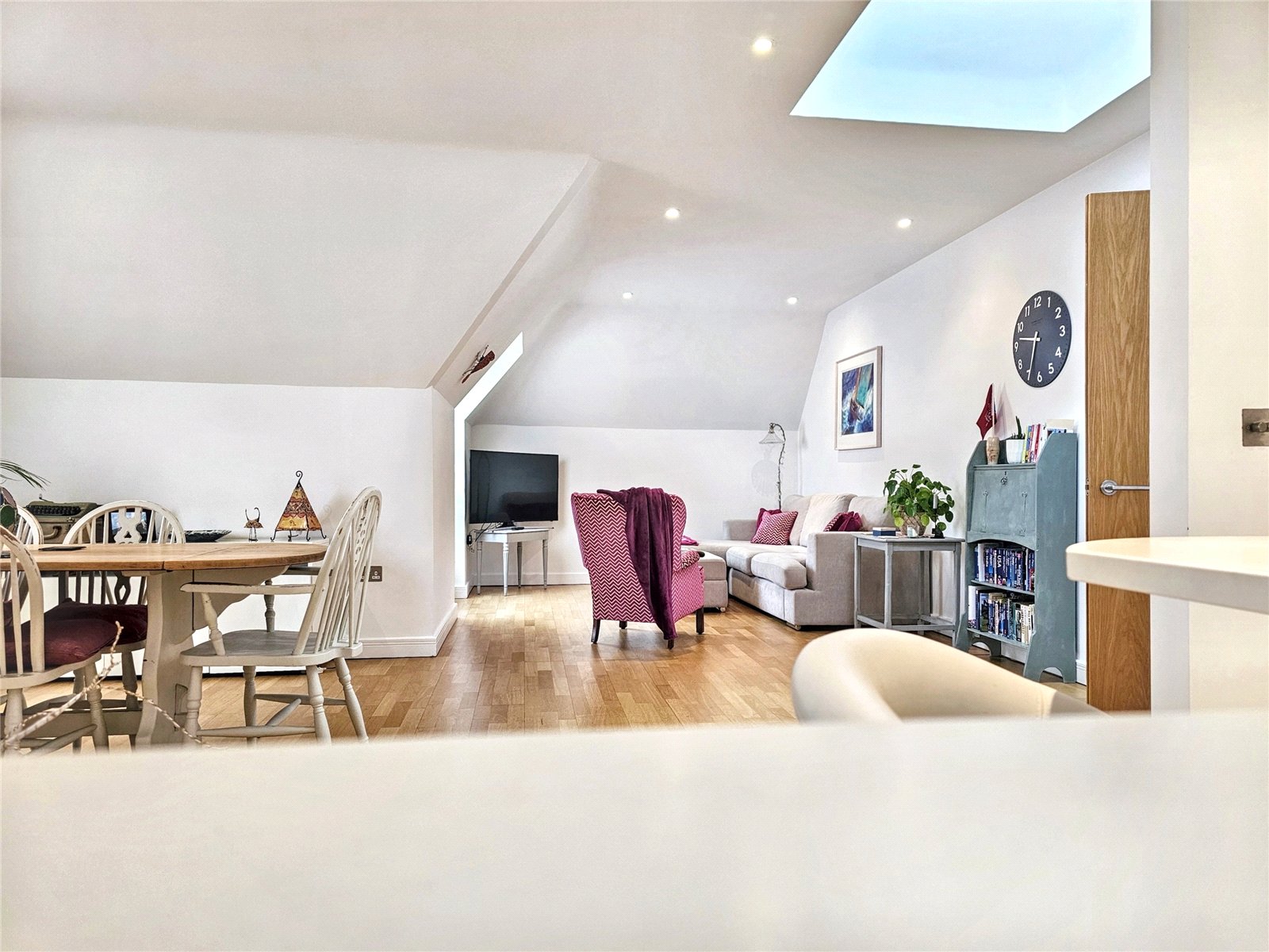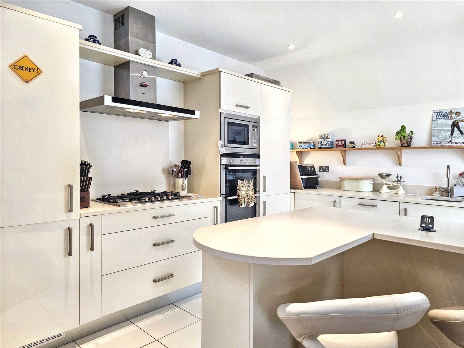 The open-plan living room/kitchen is a stunning area in which to entertain, being over 34' in length and with its roof light as well as three further Velux style westerly facing windows, is a bright and pleasing place to live. The kitchen area is fitted with a modern range of wall and base units with quality worksurfaces and a comprehensive range of fitted appliances. The peninsular breakfast bar is a delightful place to share a coffee with friends or indeed to work from home. The contemporary wooden flooring complements the elegance of the room.