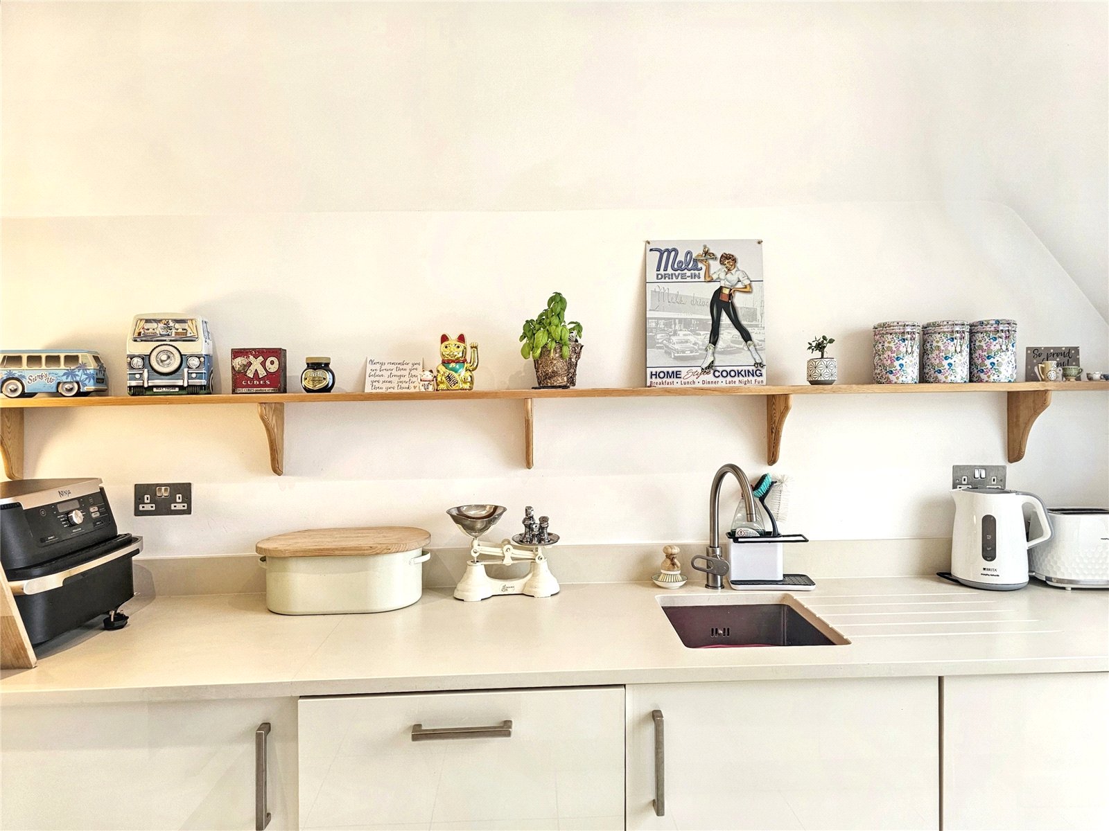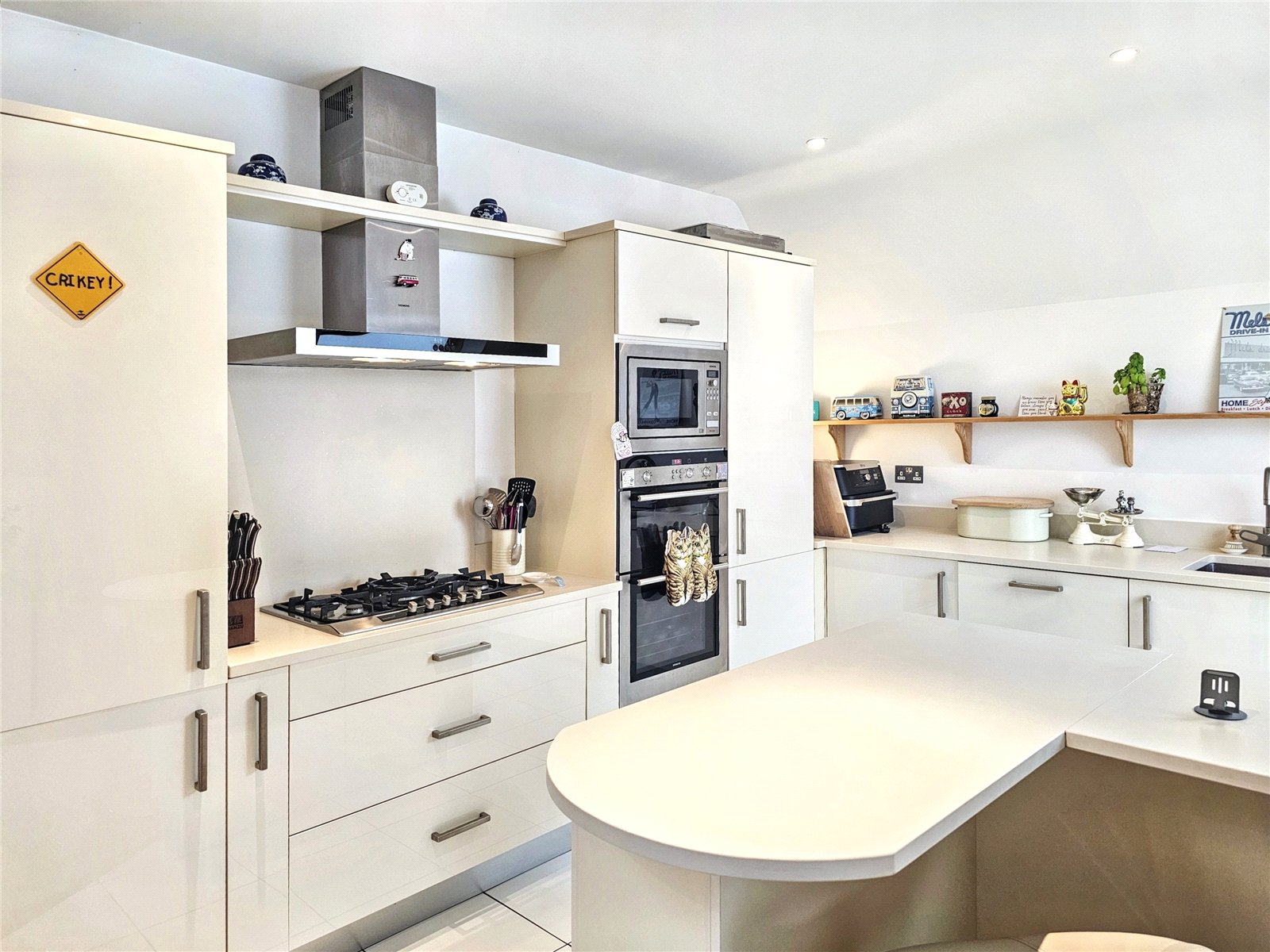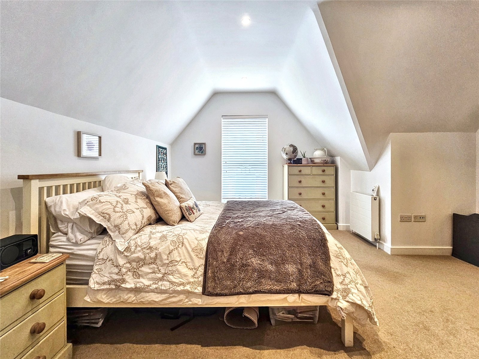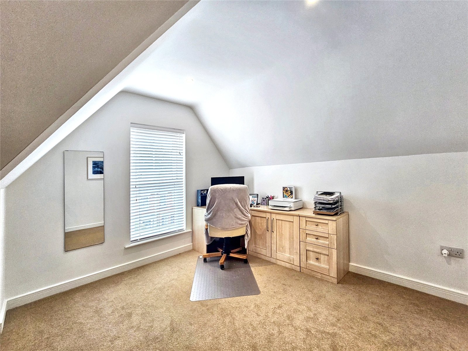 The open-plan living room/kitchen is a stunning area in which to entertain, being over 34' in length and with its roof light as well as three further Velux style westerly facing windows, is a bright and pleasing place to live. The kitchen area is fitted with a modern range of wall and base units with quality worksurfaces and a comprehensive range of fitted appliances. The peninsular breakfast bar is a delightful place to share a coffee with friends or indeed to work from home. The contemporary wooden flooring complements the elegance of the room.