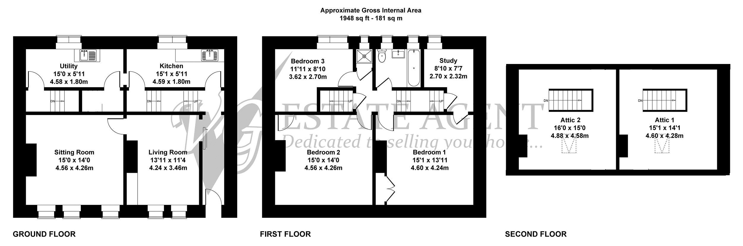 The property is ready for a full programme of renovation and offers the potential to create a stunning family home. Currently the accommodation is arranged over three floors and briefly comprises two reception rooms, kitchen, utility room, three bedrooms, study, two attic rooms, bathroom and separate shower. In addition there are two storage cellars.