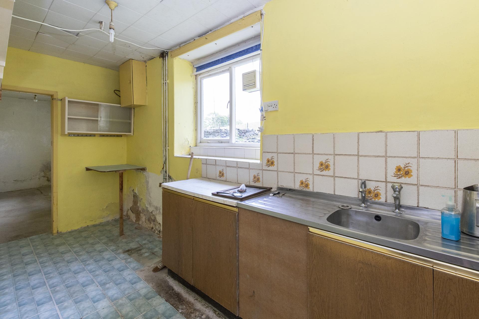 There is a galley style kitchen with some base units and sink with double drainer. The kitchen is open through to the similarly sized utility room which has a porcelain sink. Doorways from both the kitchen and utility room lead down to separate cellar rooms.