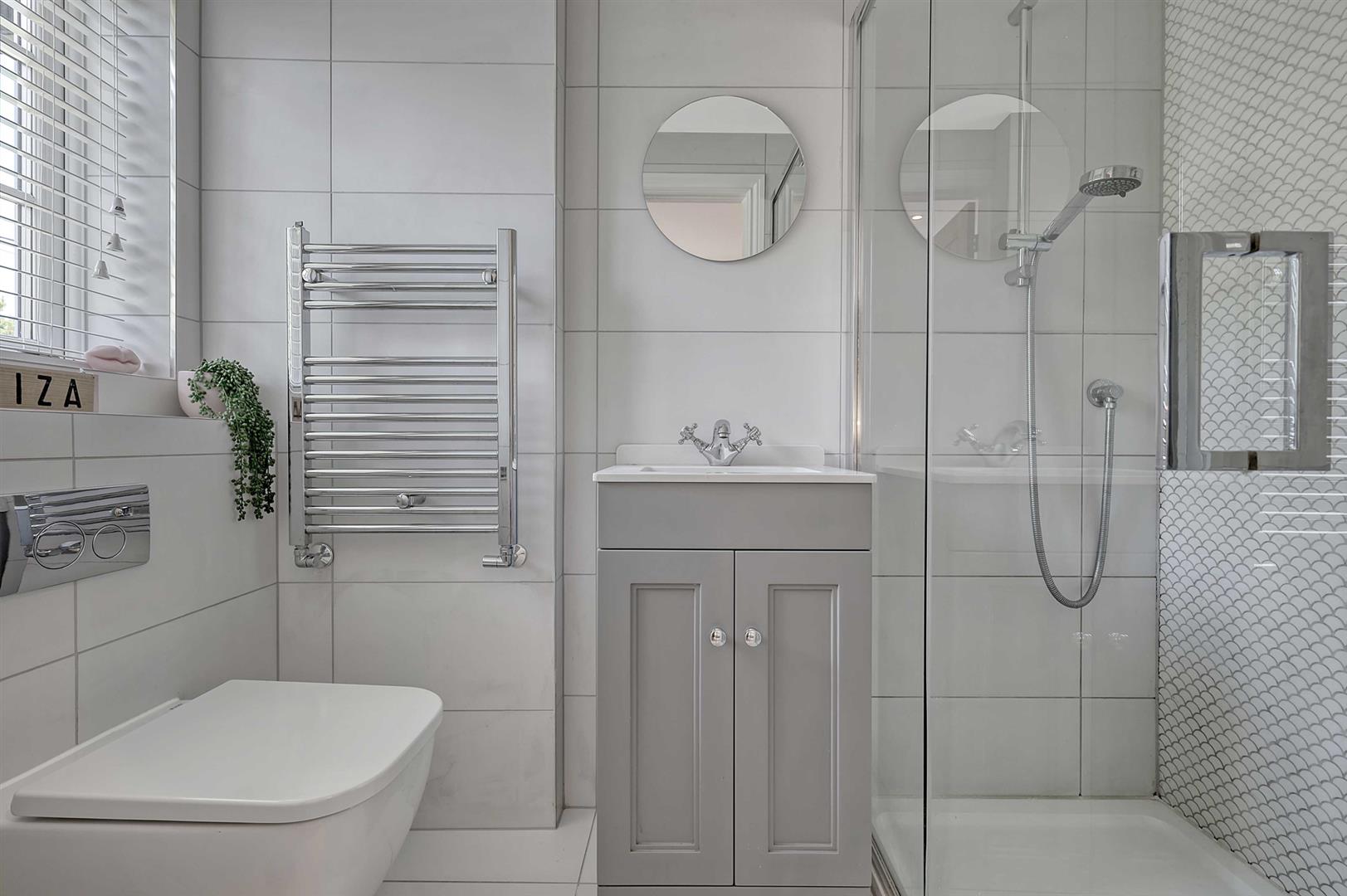 En-Suite Shower Room - 2.51 x 1.37 - White suite comprising pedestal wash hand basin, low level WC and fully enclosed, fully tiled shower cubicle with glass and chrome door. The walls are fully tiled, window to front and radiator.