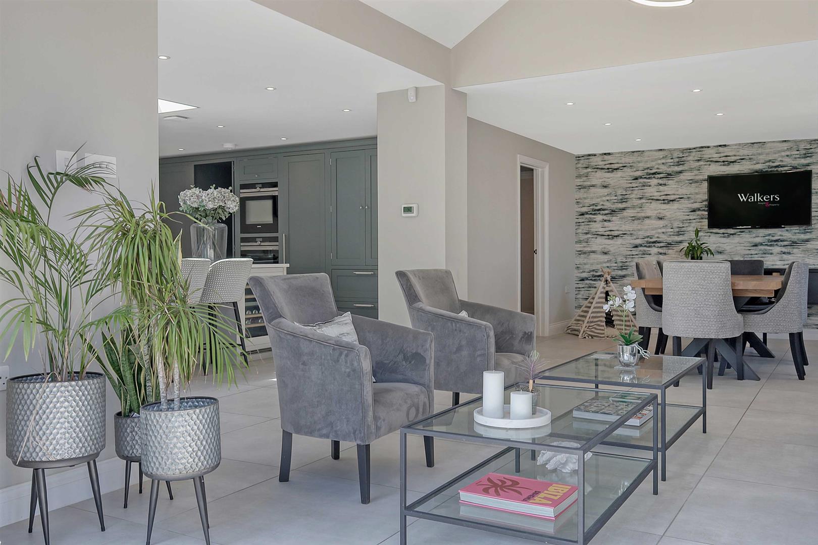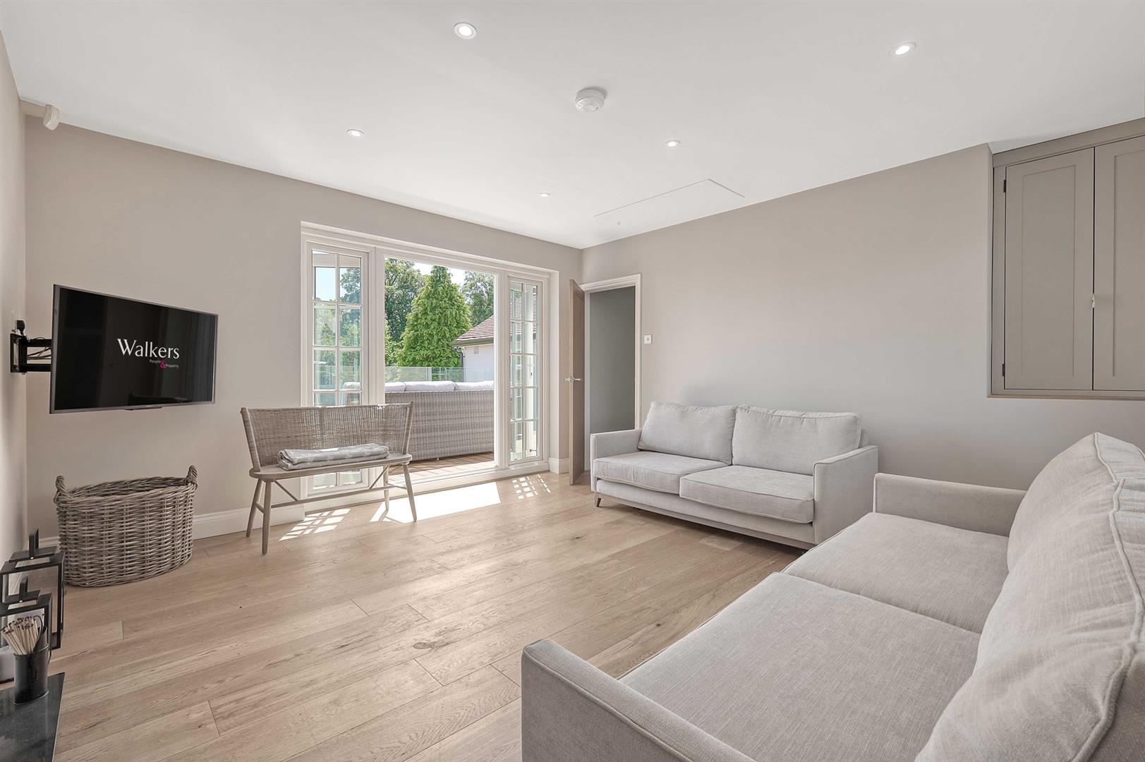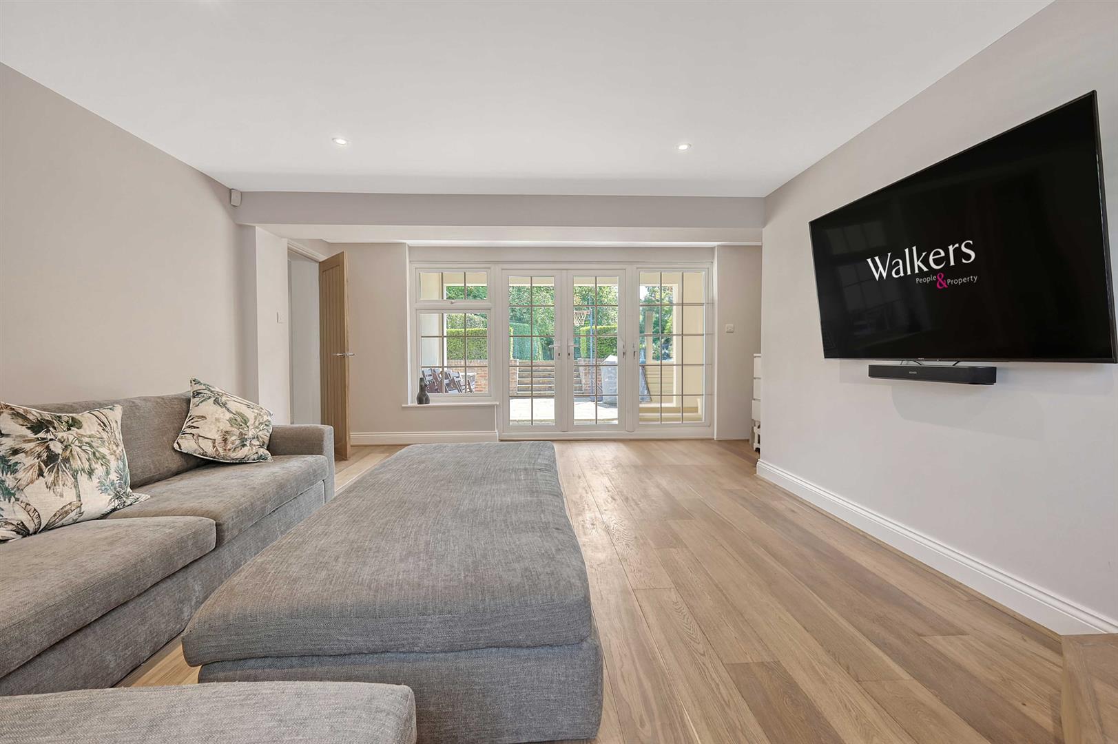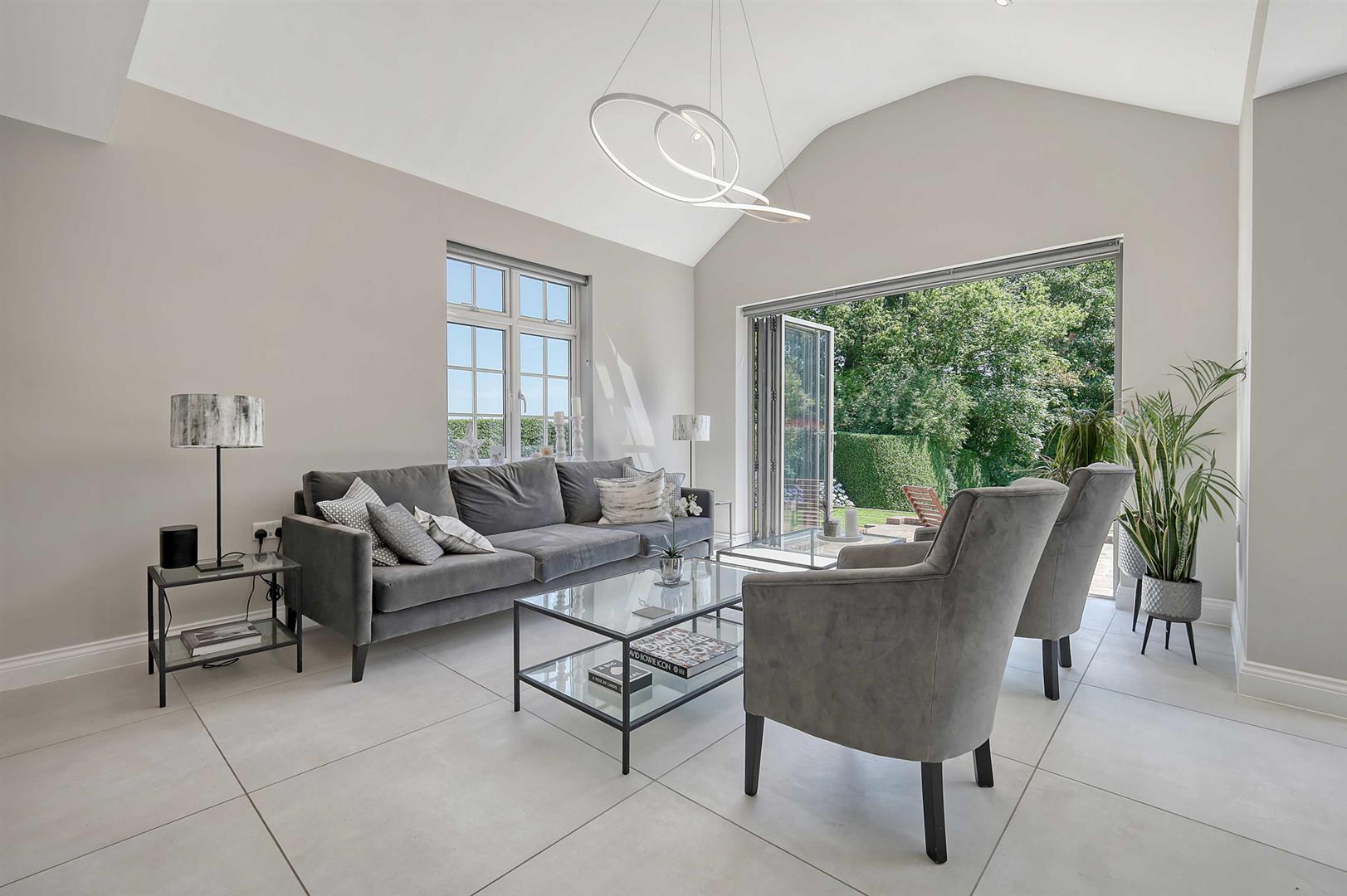 Principal Reception Room - 5.89 x 4.14 - Windows to the front elevation and double opening multi-paned French doors with matching side panels, leading onto covered sun terrace (this room could be extended to the rear to incorporate the covered sun terrace), preparation for wall mounted television, steps leading to the garden and personal door leading through to the garage.