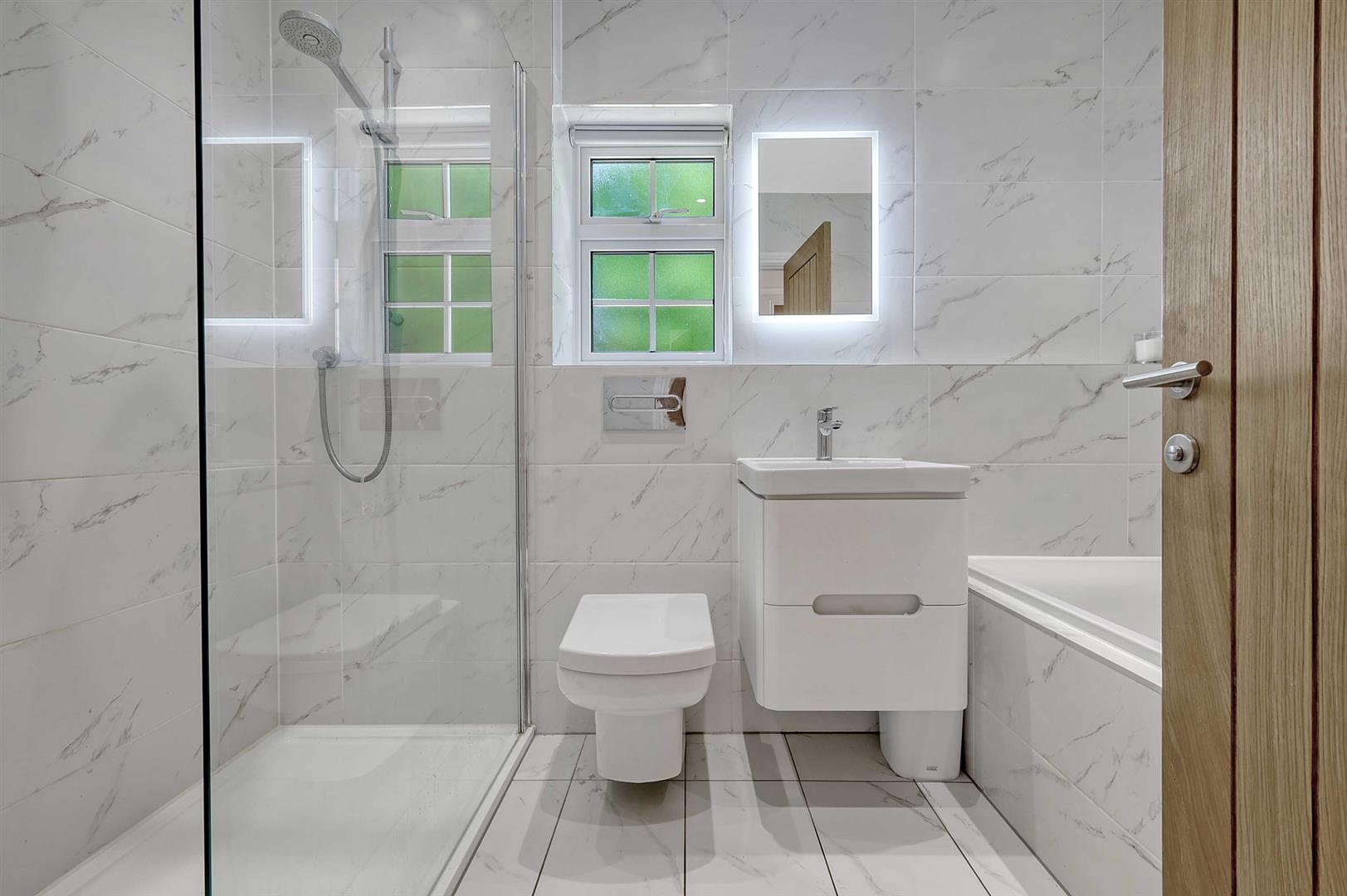 Family Bathroom - Featuring a freestanding French bath with ball and claw feet with telephone mixer tap shower attachment, modern high flush toilet and fully enclosed, fully tiled shower cubicle with glass and chrome door, pedestal wash hand basin. Recessed spotlights, opaque window to the side and radiator.