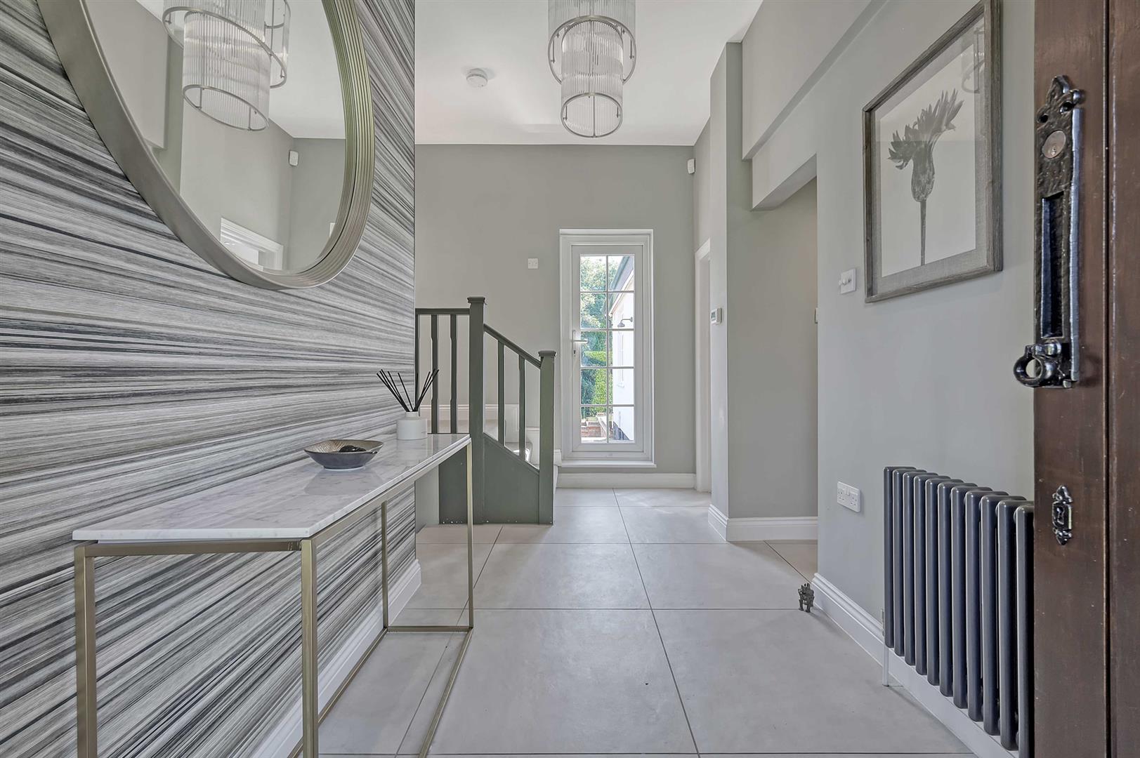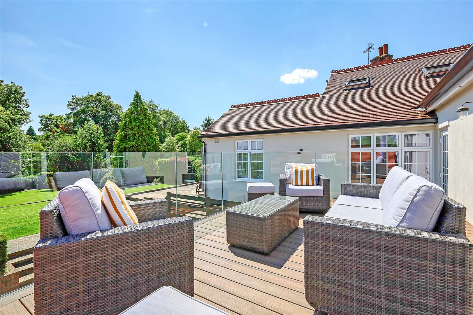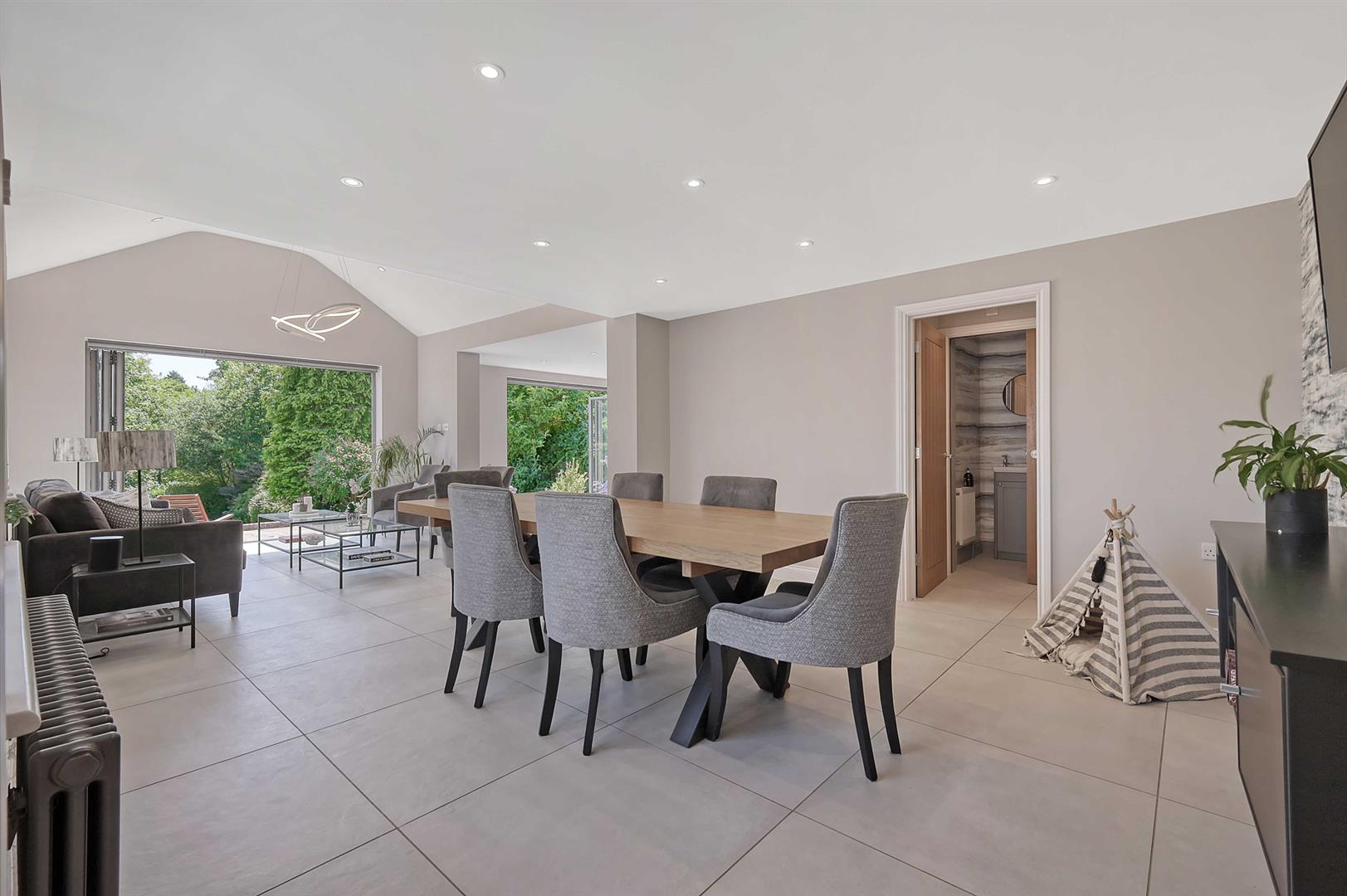 Having been substantially renovated by the present owners, the living space commences with an attractive entrance hall, which leads to a stunning bespoke kitchen by Brighton Kitchens, with open plan dining/living area and adjoining utility room. There are two main reception rooms, one to the lower ground floor with French doors to a covered terrace, the other with French doors to a raised, decked terrace, providing elevated views of the grounds. Further accommodation includes a master bedroom at first floor level with a luxury en-suite shower room, three further bedrooms - one with en-suite shower room, and a bathroom serving the two others. There is also a study/fifth bedroom to the front at ground floor level.