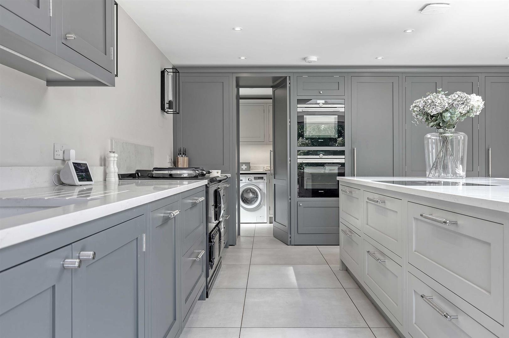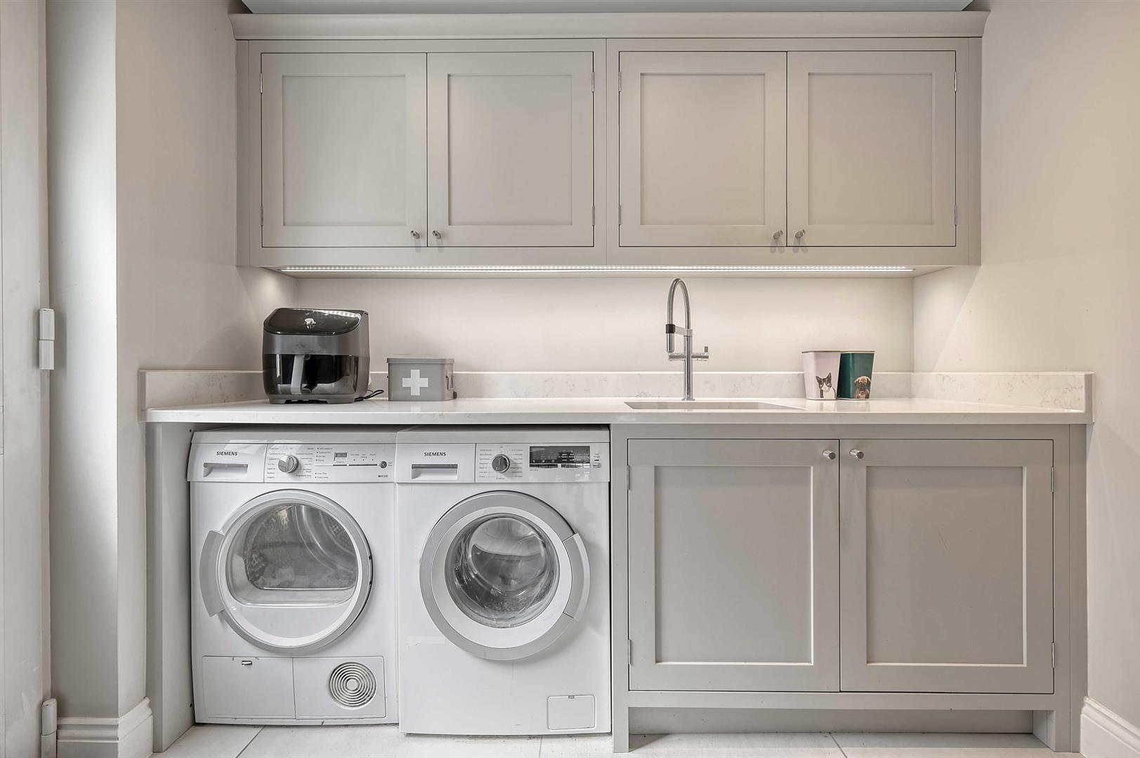 Utility Room - 3.05 x 2.13 - With French UPVC Georgian style windows to rear patio and garden, fitted to match the kitchen, also by Humphrey Munson, with full height cupboard housing washing machine and tumble dryer with additional range of storage aswell as oak wall mounted shelving, integrated Siemens freezer, butler sink with granite worktops and chrome mixer tap, recessed downlights.
