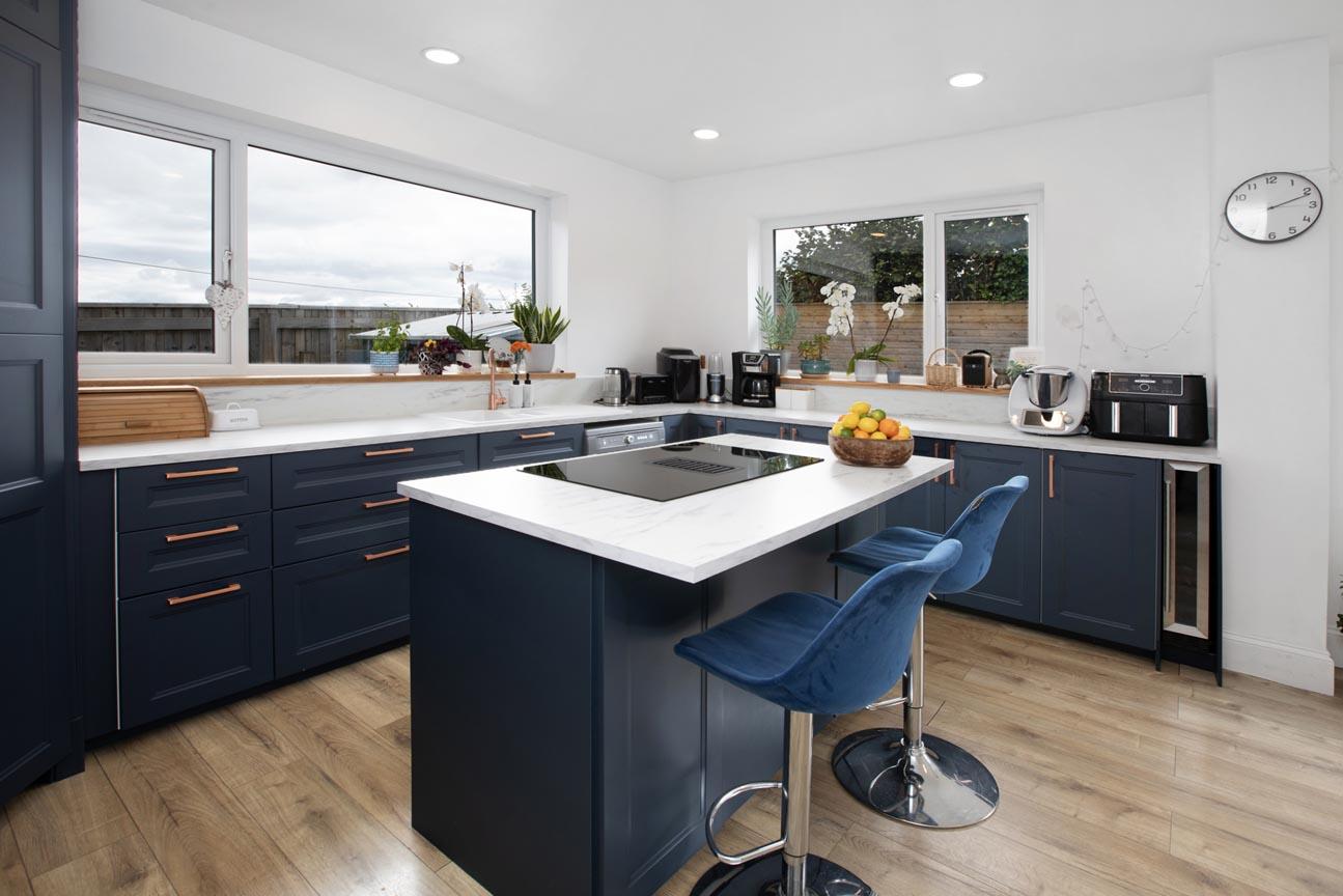 The kitchen is fitted with blue shaker-style cabinetry, white marble-effect worktops, and striking copper handles. Integrated appliances, dual-aspect windows, and a central island with an induction hob and breakfast bar make this a highly functional and visually appealing space.