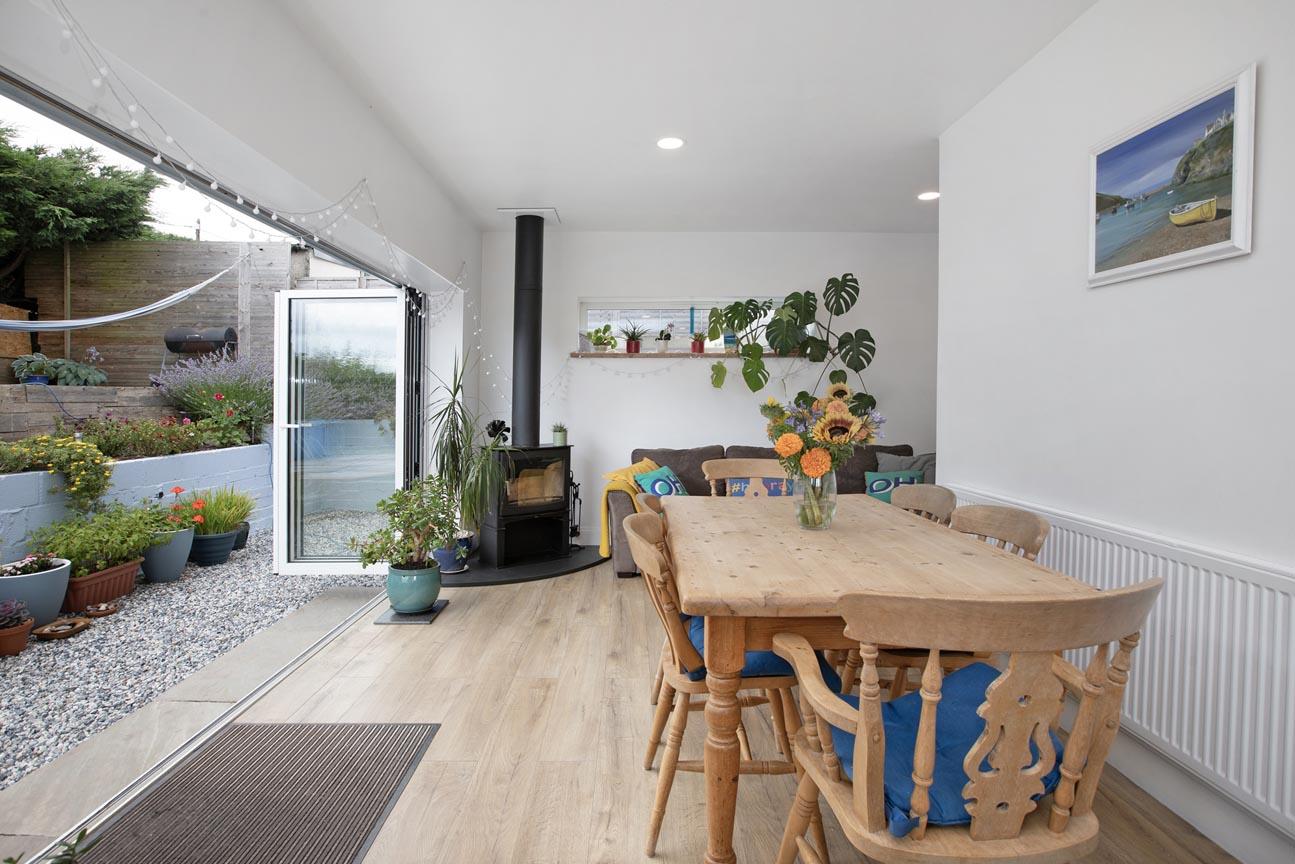 The adjacent dining and family area is spacious and welcoming, featuring wood-effect flooring, a freestanding log burner, and bi-fold doors that open fully to the garden. This seamless transition between indoor and outdoor spaces creates an ideal setting for entertaining or relaxed family life.