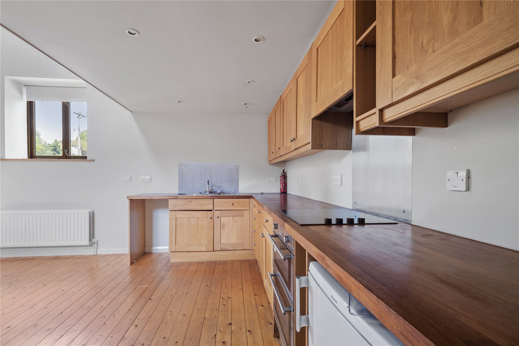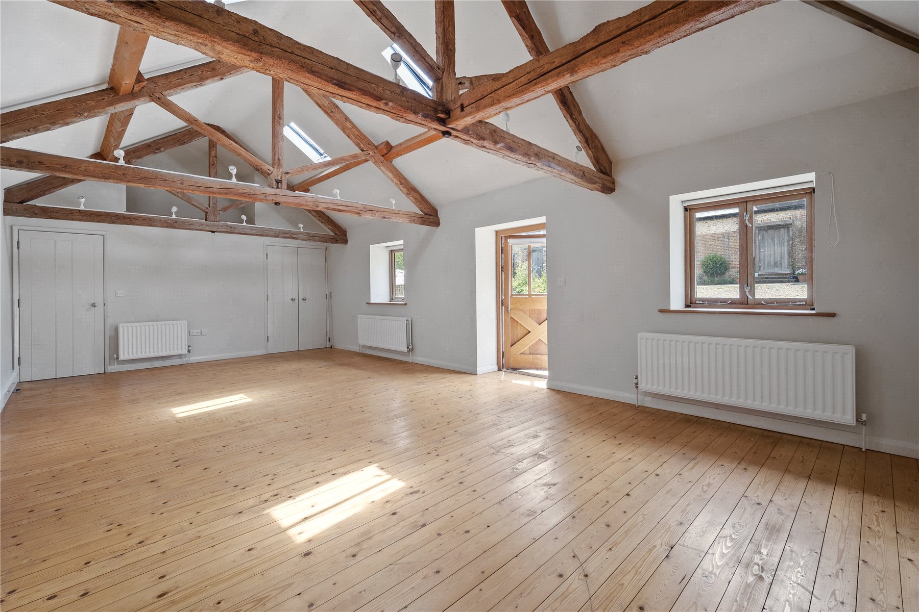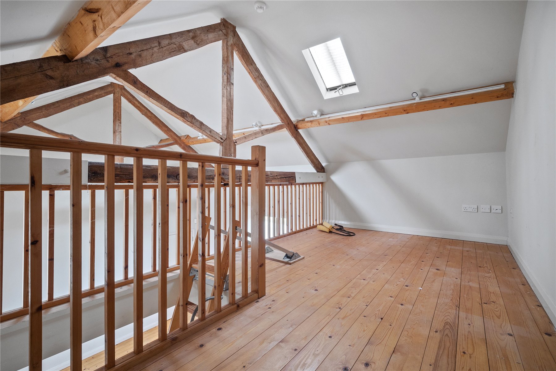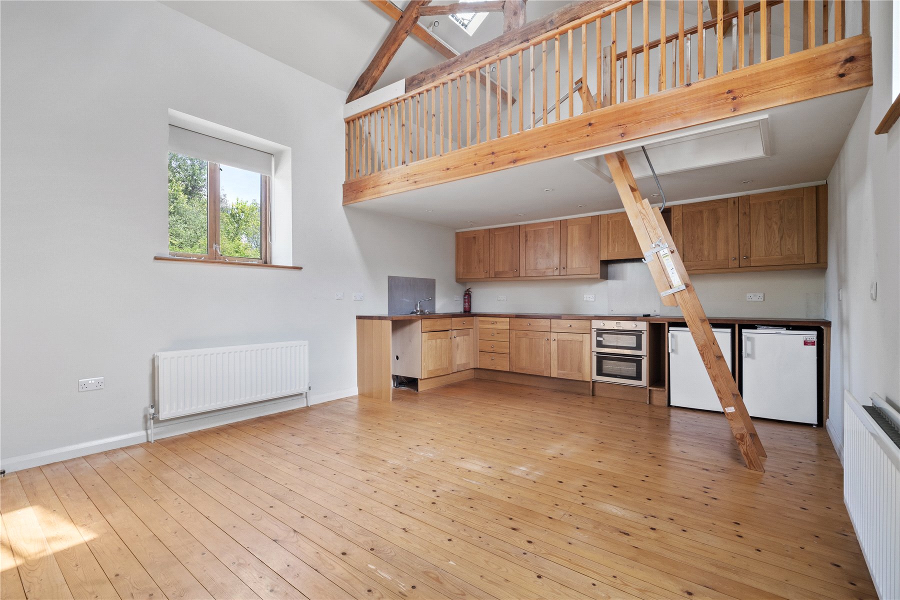 The cottage boasts an expansive KITCHEN DINING ROOM. Perfect for entertaining and culinary endeavours, the kitchen features ample countertop and storage space, double oven with electric hob, stainless steel sink and drainer, and further space and plumbing for white goods. The mezzanine level above adds an element of unique architecture, providing an ideal spot for a cozy reading nook or an additional seating area.